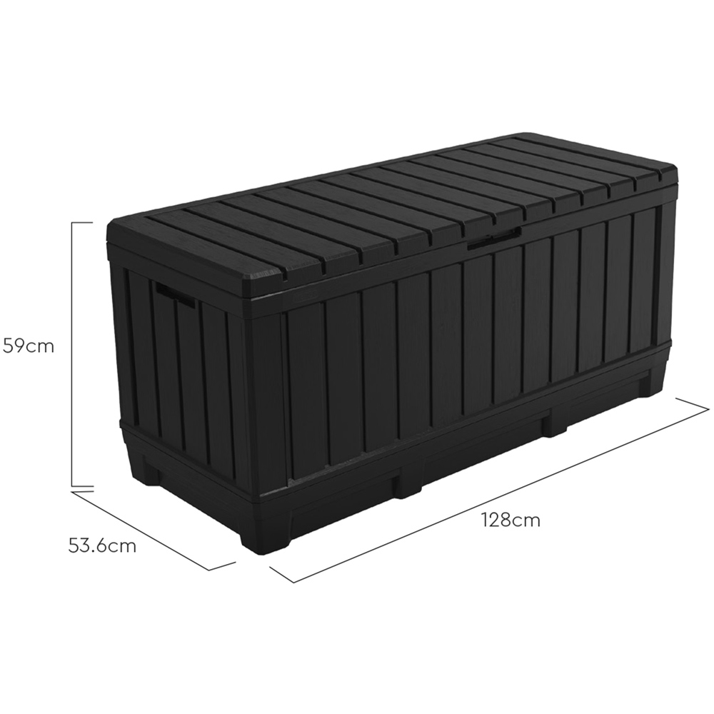 Give your outdoor space a versatile touch with this Keter Kentwood 350L Grey Outdoor Garden Storage Box. With a wood-look finish that complements any outdoor decor, this Kentwood offers 350L/92G capacity. It's an ideal solution to keep your yard organized and tidy, with plenty of room for chair cushions, pool equipment and gardening tools. Easy to assemble without any special tools, it's made from a durable resin material that's weather-resistant and maintenance-free for years. It is lockable for extra security and even has a wind lock to prevent it from blowing open. The box also has decorative wood style panels with built-in handles and comfortable seats for two adults.