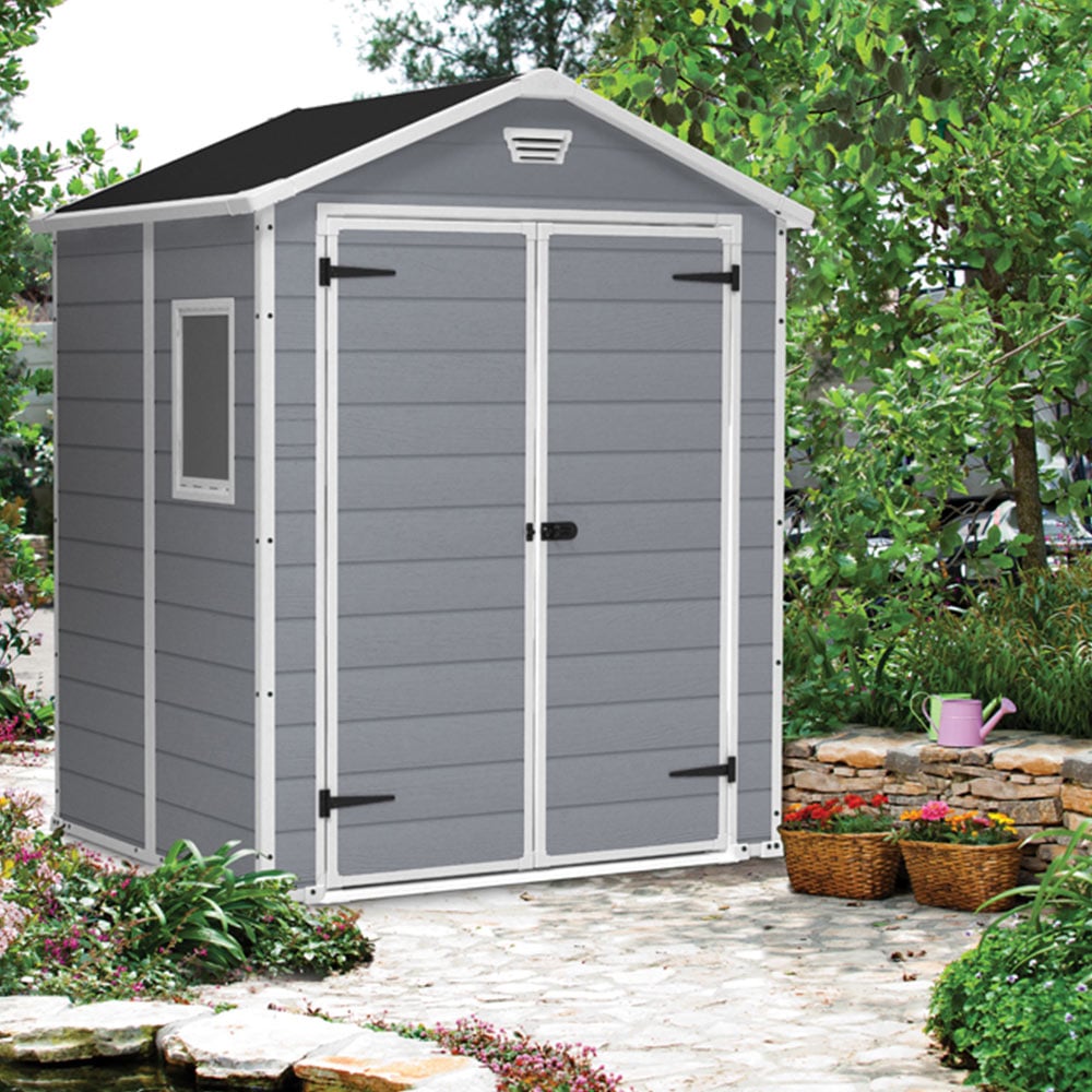 Keep your yard neat and tidy with the attractive and practical Manor 6 x 5ft Garden Storage Shed. Made with sturdy double-wall construction, weather-resistant materials and floor panel ensures your garden equipment stays clean and well protected in any weather. It also comes complete with a fixed window for natural light, double doors for easy access to your stored items, a fixed window for natural light and a locking system for added security. Floor panel with integral window for natural lighting and padlock hasp for optional added security. Ideal outdoor storage solution for all garden tools and equipment, BBQs, bicycles and DIY tools. The assembled external dimensions are H226 x W185 x L152cm, and the internal dimensions are H219 x W169 x L138cm.