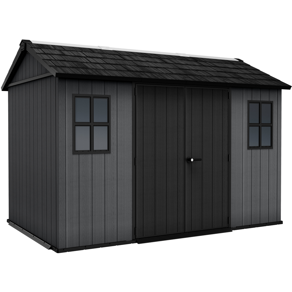 Discover the perfect blend of style and functionality with the Keter Newton Plus 11 x 7.5 ft Grey Steel Double Wall Shed. It has a new modular design that allows one shed to be built in two ways to suit the user's garden and storage needs. It adds a touch of style to the garden with modern Evotech panels. These panels give the look and feel of wood without any need for maintenance. These panels eliminate the concerns of rusting, rotting, denting, or peeling. It is built to withstand various weather conditions, boasting strength and durability thanks to its double-wall construction and steel reinforcement. It is designed with Victorian-style windows, a full-length skylight and built-in ventilation to keep things light and fresh. The shed also features a heavy-duty floor and lockable double doors to protect and store ride-on lawnmowers and heavy-duty tools. Offering unmatched versatility, this shed can be configured as a wide 11 x 7.5ft shed or a narrow 7.5 x 11ft shed. This is an ideal storage shed for wider spaces.
