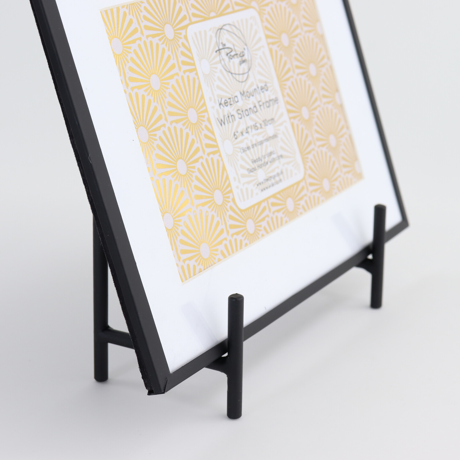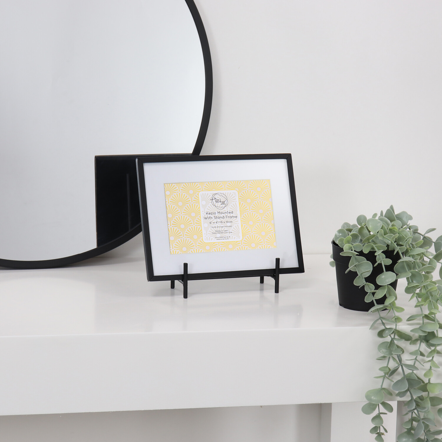 Showcase your cherished memories beautifully with the Kezia Mounted With a Stand Frame. Its sleek black frame and contemporary stand, paired with a crisp white inlay, create a minimalist aesthetic that enhances any space. Perfect for your mantle, sideboard, or bedside table, this stylish frame is designed to highlight your precious photos with elegance.