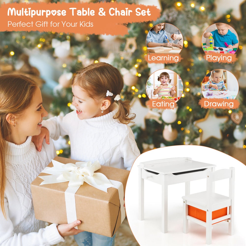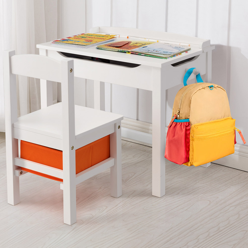 Ensure your child enjoys a comfortable and organised learning environment with the Costway Kids White Table and Chair Set with Hidden Space and Hook. Crafted from solid wood and MDF, this durable set is designed to support up to 30kg on the desk and 70kg on the chair, making it a robust choice for daily use. The flip-up desktop reveals a spacious storage area perfect for books and supplies, while the safety slow-dropping hinge prevents sudden closures. Rounded corners and smooth edges enhance safety by minimising the risk of bumps or scratches. Additionally, the chair features a built-in storage box and a handy side hook for hanging essentials like a backpack or water bottle. This set not only provides a comfortable seating and working space but also helps inculcate good organisational habits from a young age.