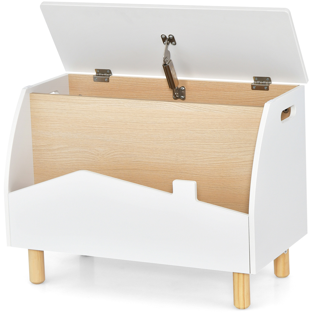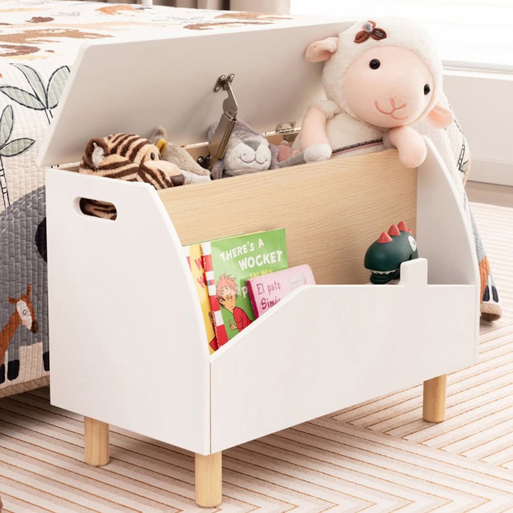 Brighten up any room while keeping it tidy with the Costway White Kids Toy Box with Safety Hinge. Made from sturdy MDF, this toy box promises durability and is designed with children's safety in mind, featuring a safety hinge that prevents the lid from slamming shut and rounded corners to minimise the risk of injury. The water-resistant lacquer surface is a breeze to clean, maintaining its fresh look with minimal effort. With two storage compartments and a front open bookshelf, it offers ample space to store toys, books, and more, helping children develop good organizational habits. Whether placed in a playroom, bedroom, or living room, its charming appearance and functional design make it a must-have for a neat and safe space.