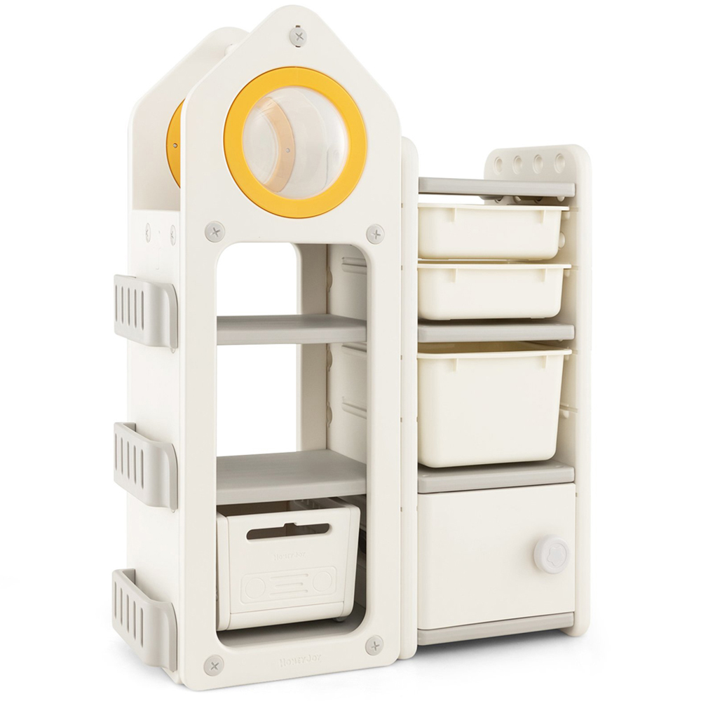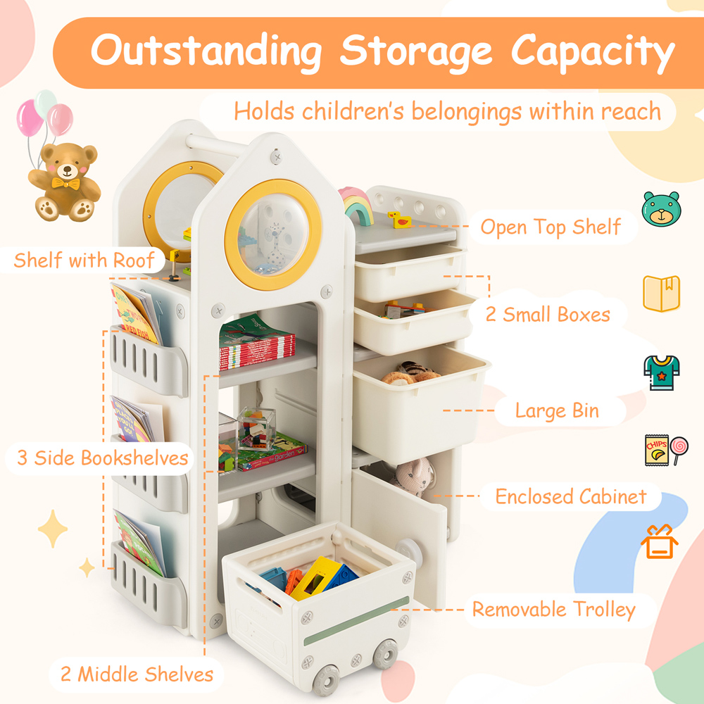Encourage your little ones to keep their play area tidy with the Costway Beige Kids Toy Storage Organiser with Mobile Trolley and Unique Roof. Designed to foster good organisational habits, this organiser offers multiple storage solutions including shelves, a removable trolley, small boxes, and an enclosed cabinet, making it perfect for toys, books, and other knick-knacks. Safety is a top priority with features like an anti-toppling device, anti-falling slots, and rounded corners to protect delicate skin. The use of certified safe materials ensures durability and resistance to wear, making this organizer a lasting addition to any child's room. This toy storage organizer includes shelf with roof, three side bookshelves, two middle shelves, removable trolley, open top shelf, two small boxes, one large bin, and one enclosed cabinet.