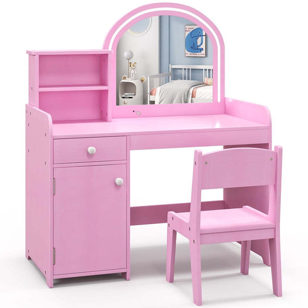 Step into a magical grooming experience with the Costway Kids Pink Vanity Table and Chair Set with Storage. This enchanting set not only captivates with its aesthetics but also ensures utmost safety and functionality. The acrylic mirror, surrounded by 120 LED lights, offers both warm and cool lighting options, making it a centrepiece that's as practical as it is delightful. A spacious 2-tier shelf, a pull-out drawer, and an enclosed cabinet provide ample storage, making organisation a breeze. The set's design prioritises safety with rounded corners, burr-free surfaces, and an anti-tipping kit for added stability. The chair complements the table perfectly, featuring a cosy backrest and a roomy seat to support healthy sitting habits. With its sturdy construction and user-friendly features, this vanity set is a wonderful addition to any child's room.