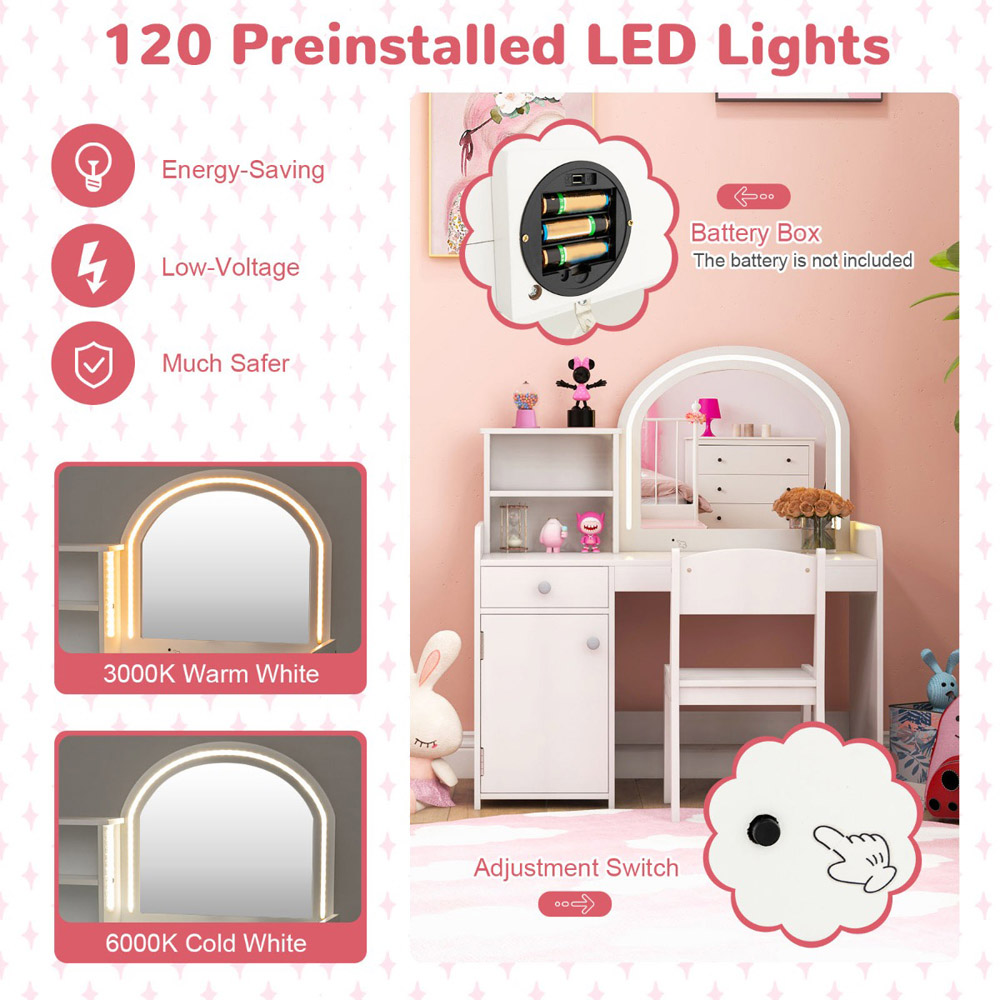 Step into a magical grooming experience with the Costway Kids White Vanity Table and Chair Set with Storage. This enchanting set not only captivates with its aesthetics but also ensures utmost safety and functionality. The acrylic mirror, surrounded by 120 LED lights, offers both warm and cool lighting options, making it a centrepiece that's as practical as it is delightful. A spacious 2-tier shelf, a pull-out drawer, and an enclosed cabinet provide ample storage, making organisation a breeze. The set's design prioritises safety with rounded corners, burr-free surfaces, and an anti-tipping kit for added stability. The chair complements the table perfectly, featuring a cosy backrest and a roomy seat to support healthy sitting habits. With its sturdy construction and user-friendly features, this vanity set is a wonderful addition to any child's room.