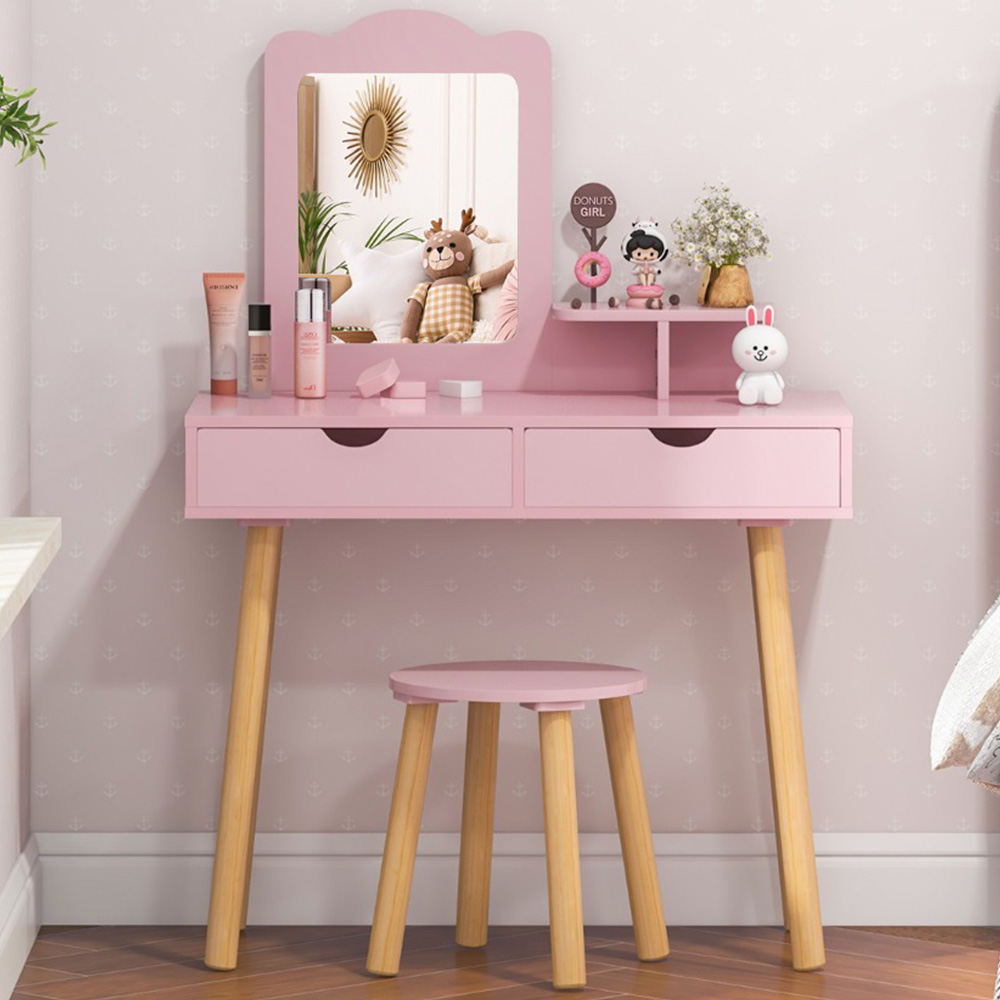 Bring joy and a touch of glamour to your little one's room with the Costway 2 Drawer Kids Pink Vanity Table and Stool Set with Mirror. This ergonomic set not only offers a comfortable makeup experience but also transforms into a study desk with its detachable top, making it a versatile addition to any child's space. The durable construction of solid pine wood and MDF ensures it can withstand enthusiastic use, providing a reliable piece of furniture that grows with your child. With ample storage including two large drawers and a shelf, this vanity set keeps all beauty accessories and stationery neatly organised, while the safe design with rounded corners and a burr-free surface makes it a worry-free choice for parents.