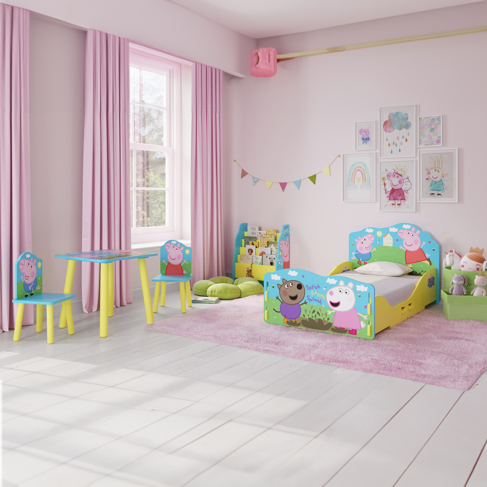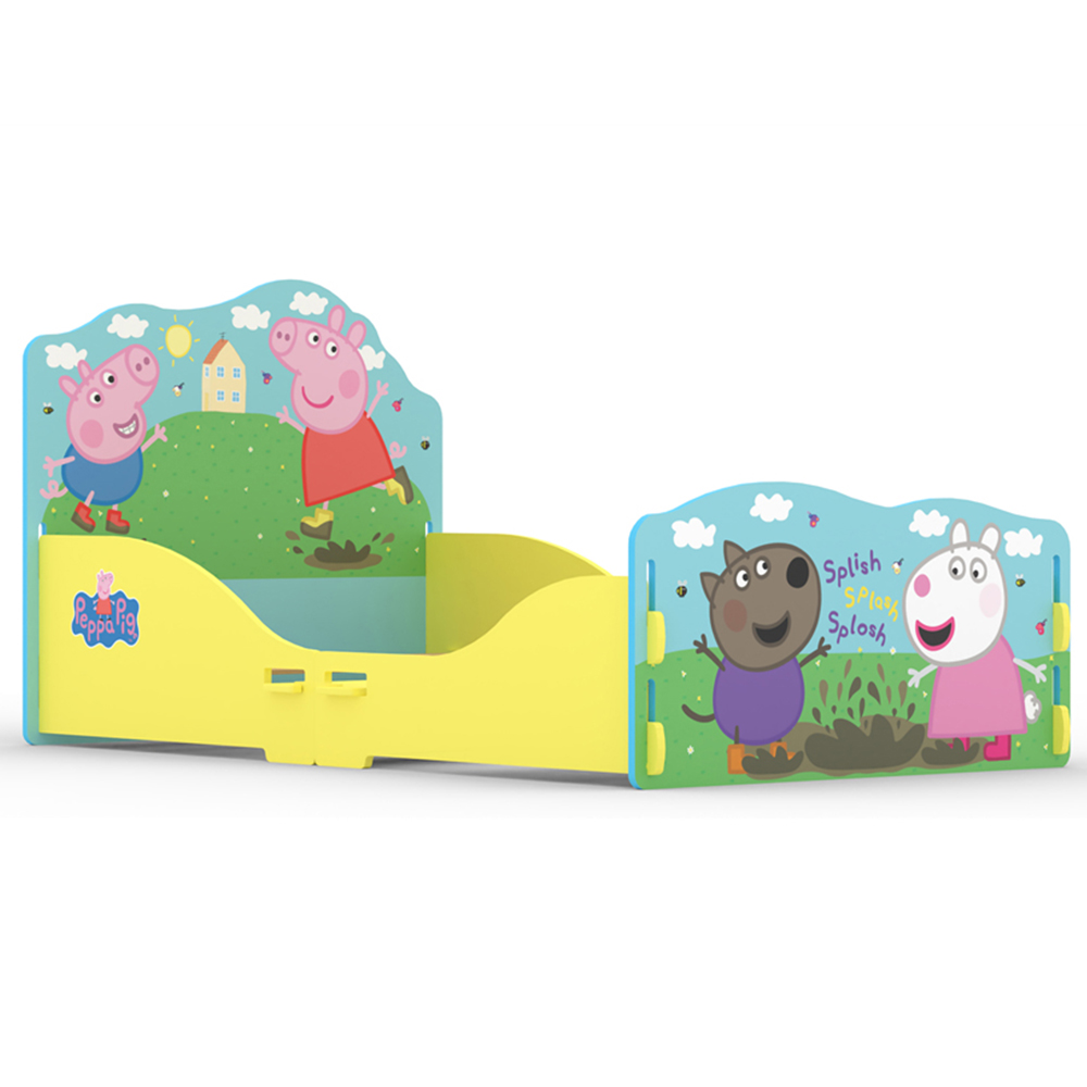 Splish, Splash, Splosh! Peppa and friends love playing in the mud. This Peppa Pig toddler bed with a mattress size of 140cm x 70cm is the perfect addition to any Peppa Pig fan's bedroom! Featuring Peppa, George and friends in high-quality print. It's bright, colourful and fun. The bed is easy to assemble, it slots together with a few screws to secure the base to make a sturdy yet fun structure! Ideal for children transitioning from a cot to a ‘grown-up’ bed!
