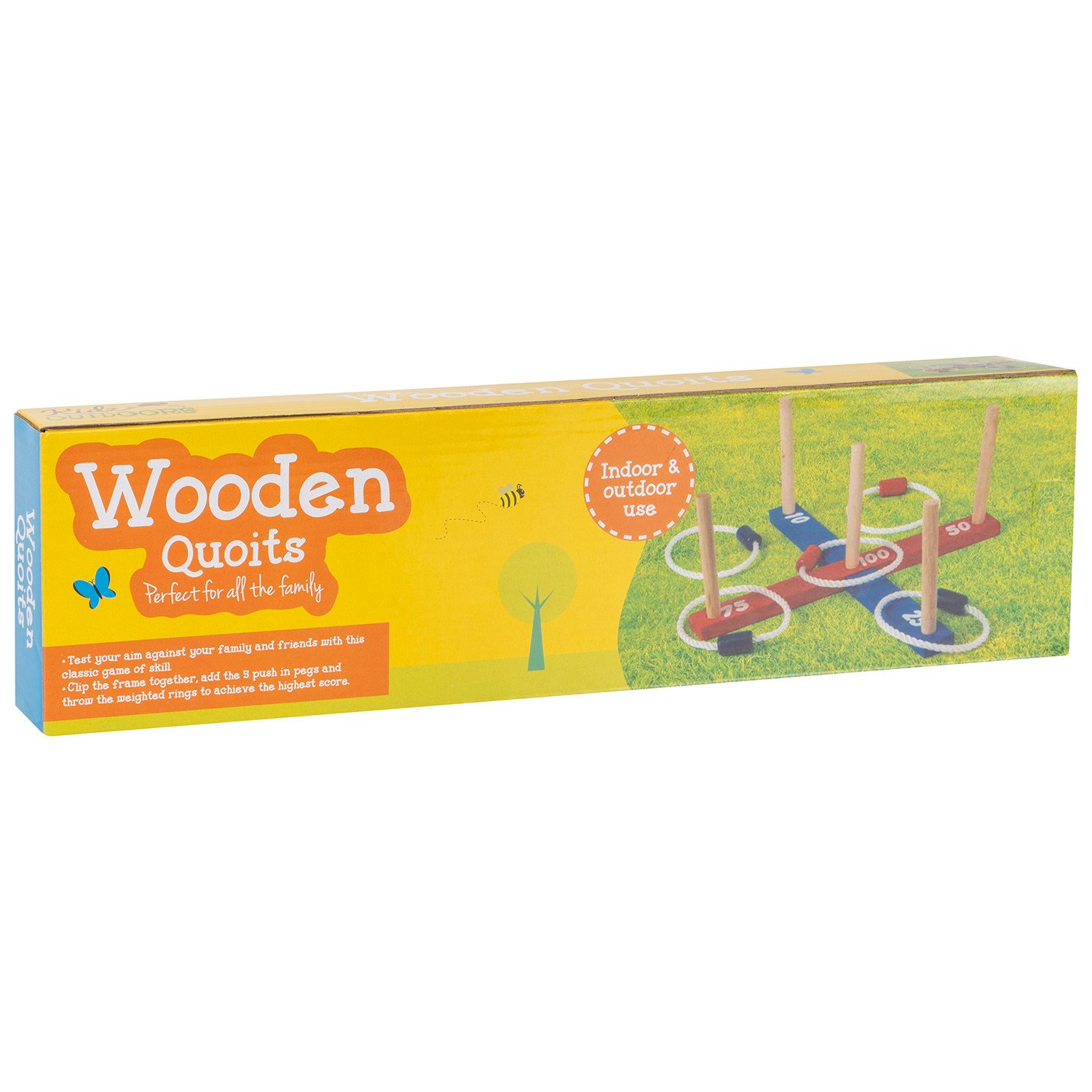 Wooden Quoits is the classic ring-toss game that can be played both indoors and outdoors! Test your aim against your family and friends with this game of skill and see who can achieve the highest score. This game is easy to set up and pack away, making it perfect for family days out and taking with you on holiday. Simply clip the frame together and add the 5 push-in pegs for instant fun with the family.