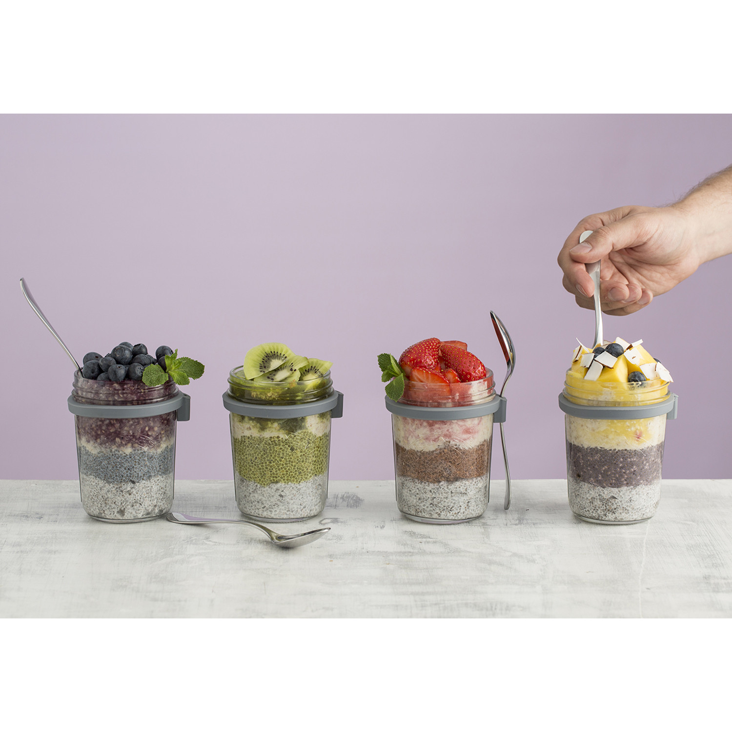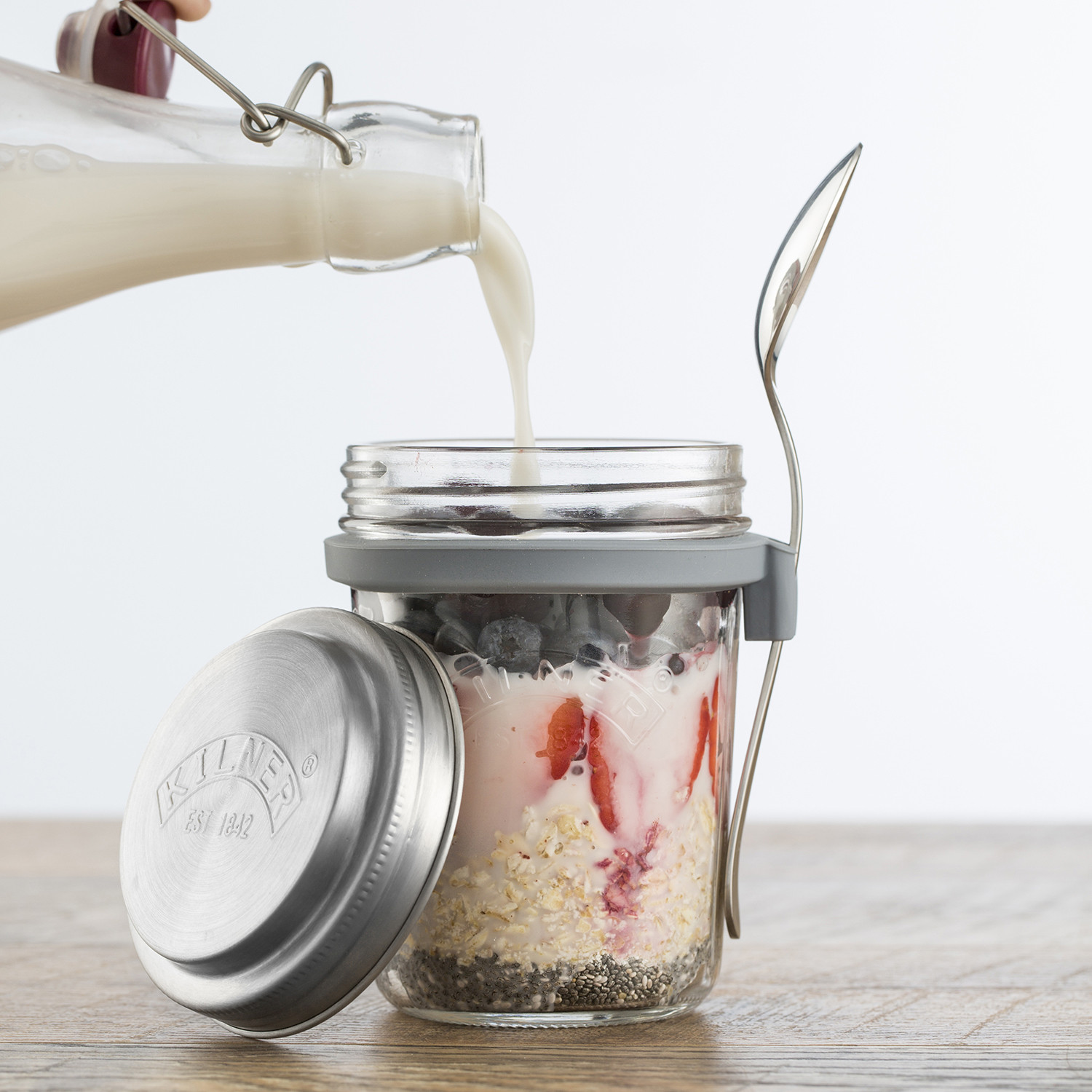 The Kilner Breakfast Jar Set is a unique way to store and consume breakfast snacks whether at home or on the go. Included in the set is a Kilner 0.35 Litre Wide Mouth Jar which comes with a unique stainless steel lid that doubles as a measuring cup for better portion control. This set also includes a stainless steel spoon, silicone spoon holder and airtight sealing disc.
