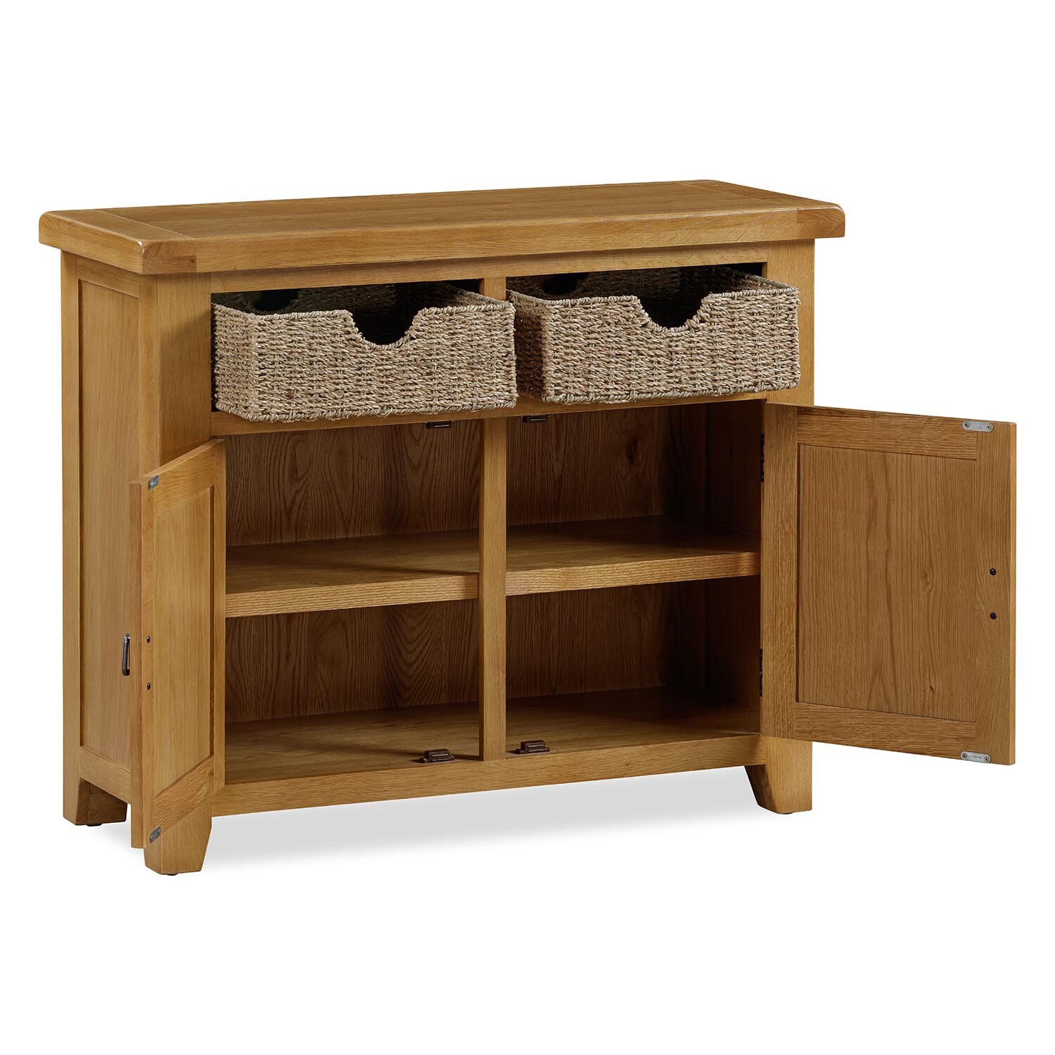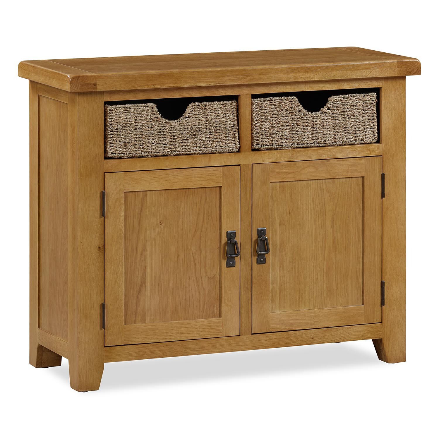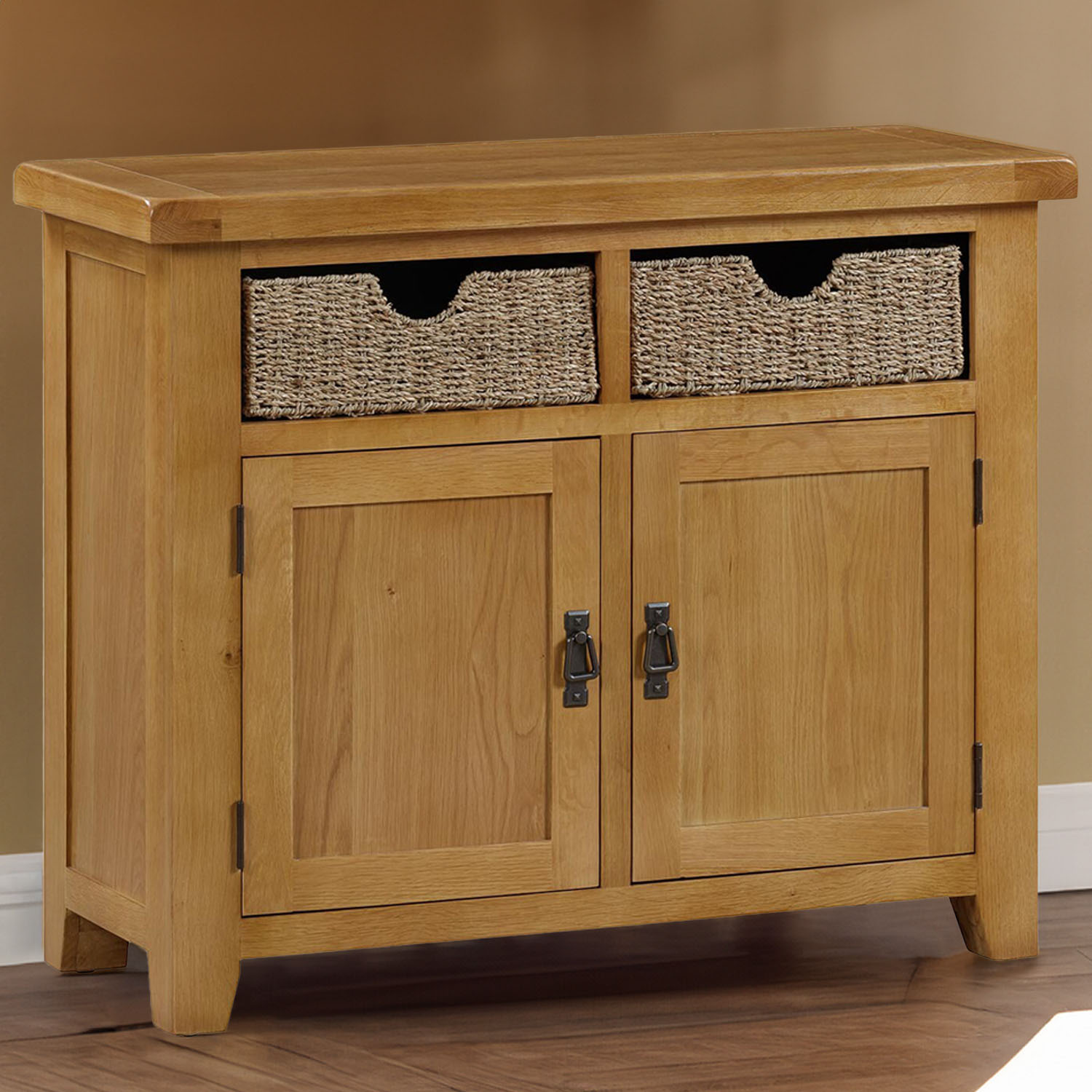 Elevate your ambience with this Kinsale 2 Door 2 Basket Drawer Oak Sideboard. With a sturdy solid oak construction and natural wax finish making, the sideboard is a desirably rustic and traditional storage solution. This attractive unit features two deep sedge basket drawers and one spacious two-door cupboard with a dividing shelf. Ornate drop ring metal handles complete its classic look and allow it to blend impeccably with your existing decor. It's the perfect way to ensure your home is neat, organised and fashionable.