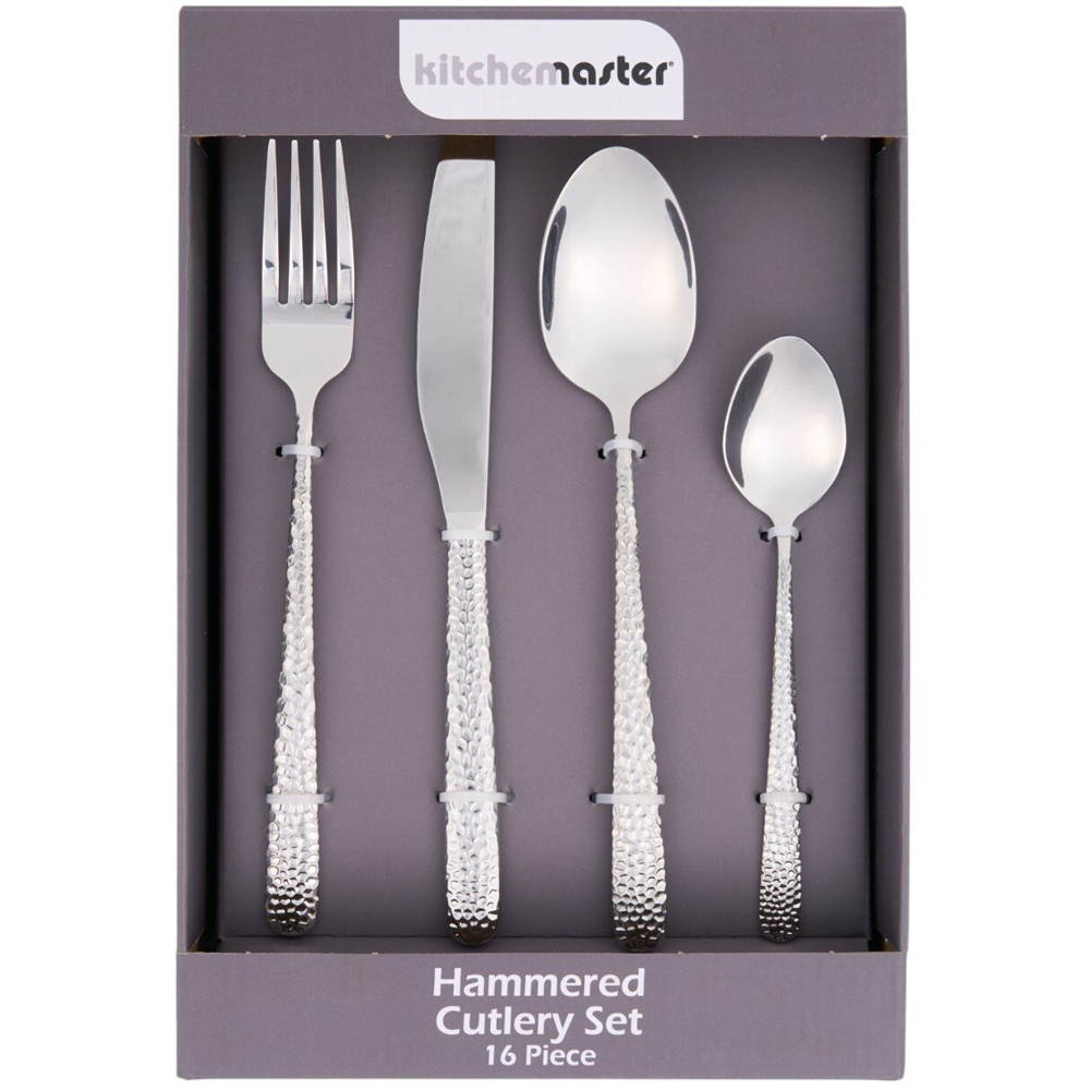 Add a touch of modern style to your table setting with the Kitchen Master 16 Piece Hammered Cutlery Set. Each piece is ergonomically designed with a rust-resistant build for durability. It is safe for dishwasher use, ensuring effortless cleaning. The striking hammered finish brings a hint of modernity to your table setting, instantly elevating all your dining moments.