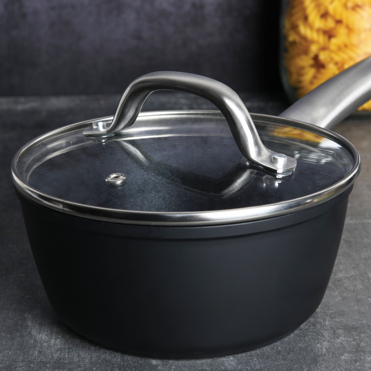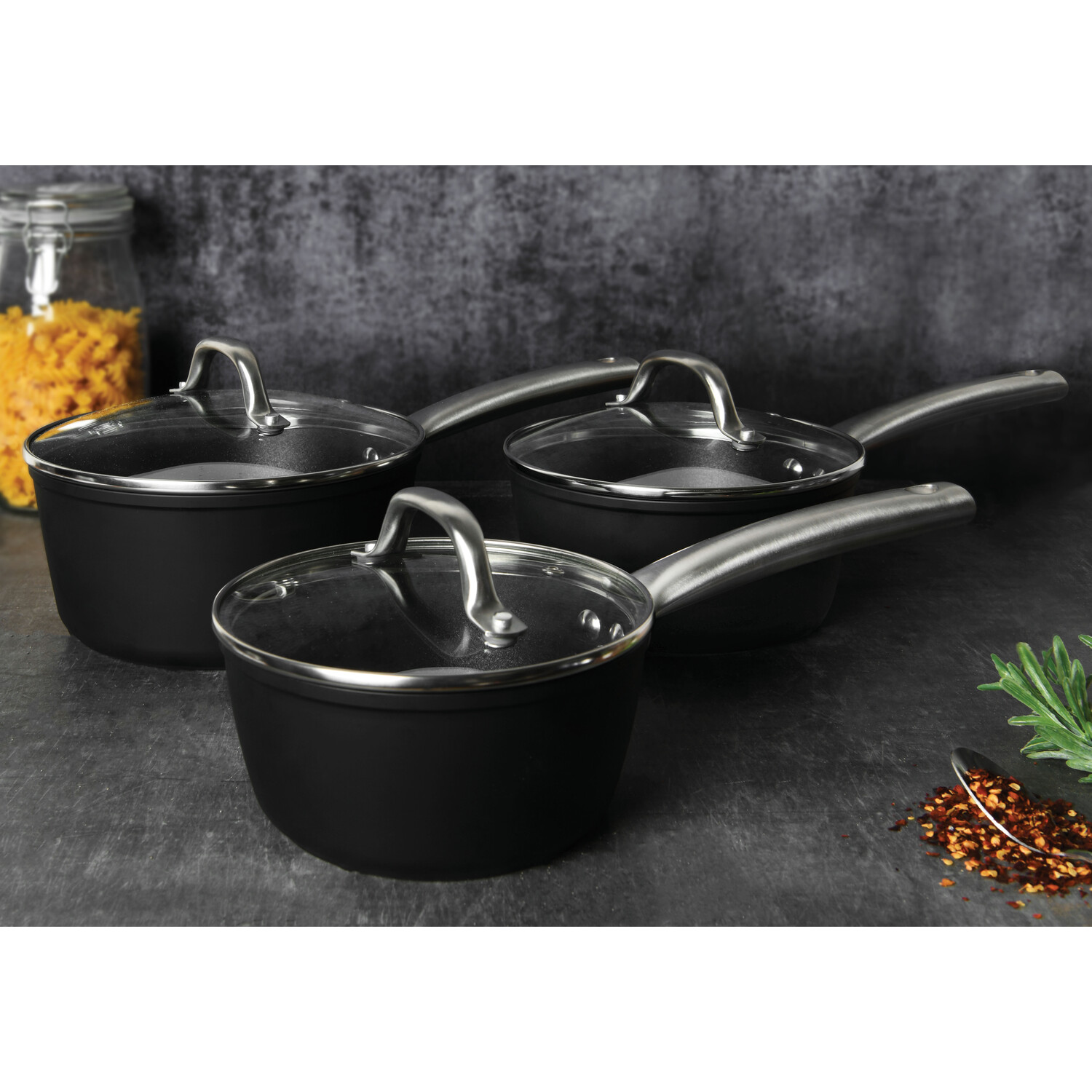 The 3-Piece Kitchen Master Forged Pan Set is the perfect collection for your kitchen. Made from heavy-duty forged aluminium, they deliver superior durability and endurance whilst delivering superior heat conductivity and distribution for a more efficient cooking experience. The pans have been finished with a double-layer non-stick coating that's PFOA for ease of use and cleaning. Each pan has a riveted stainless steel handle, is oven-safe up to 180 degrees, and is suitable for all hob types, including induction. The lids are made from tempered glass with a steam vent. Ideal for most types of cooking, these are a brilliant addition to your kitchen.