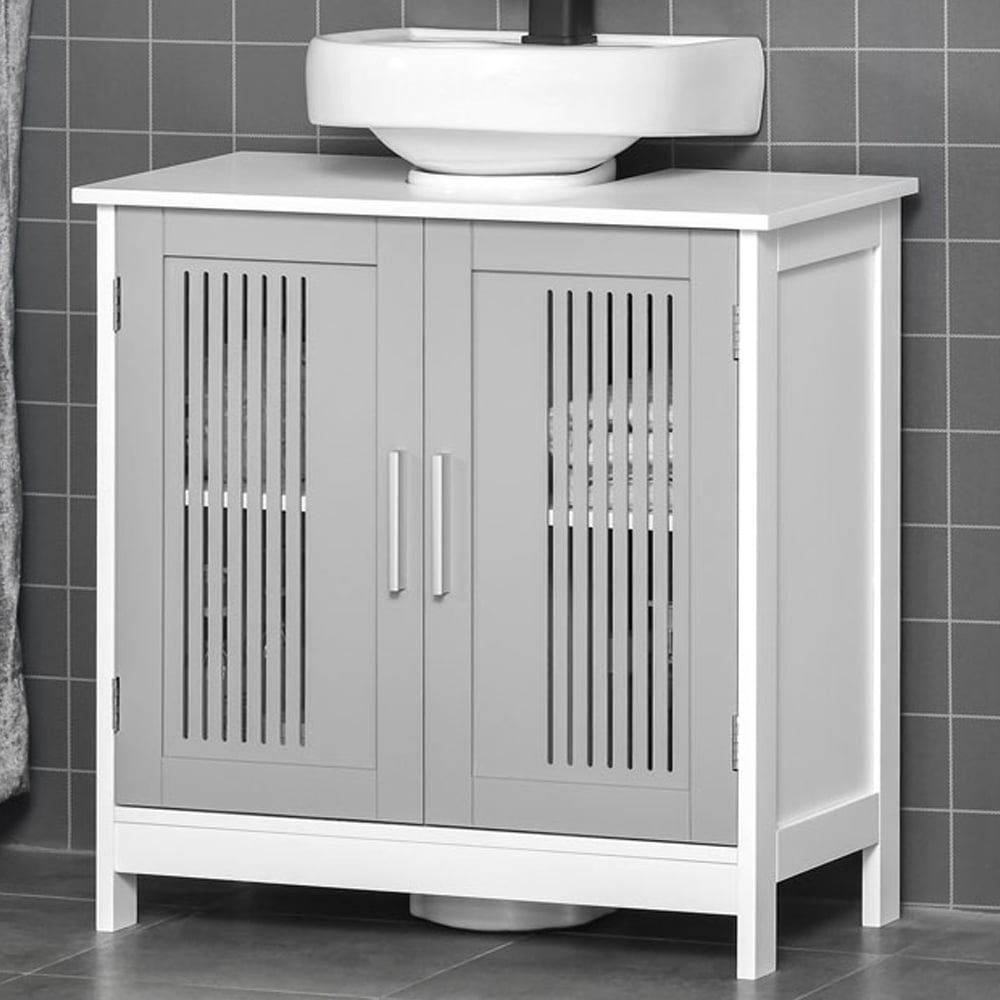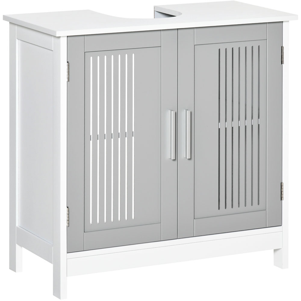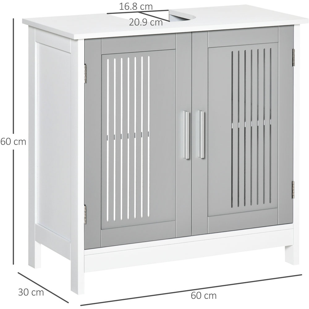 Enjoy a more organised space with Kleankin 2-Door Bathroom Cabinet in grey. This Kleankin under-sink cabinet is great for freeing space in the bathroom. This cabinet boasts a simple and clean design, making it suitable for practically any home style. Made from MDF, this piece is sturdy and durable for everyday use. The inner adjustable shelf moves up and down to set the area to a size you want. Caters for smaller and larger items. The slatted doors allow air to flow in and out, as well as prevent steam and mildew from build-up inside. Longline handles on doors to open easily. W16.8 x D20.9cm U shape.