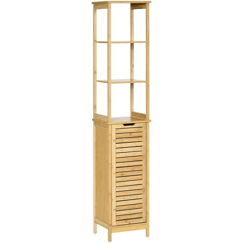- Organise compact baths easily with this Kleankin Tall Bamboo Bathroom Cabinet. With three upper shelves and a bottom cupboard, this cabinet gives you plenty of storage for the surrounding space. Made from a bamboo frame, it's strong, sturdy and naturally resistant to rotting and bacterial build-up. Apart from this, it is fitted with a slatted door to promote better airflow. Featuring a tall and narrow design the unit makes an ideal option for smaller spots.