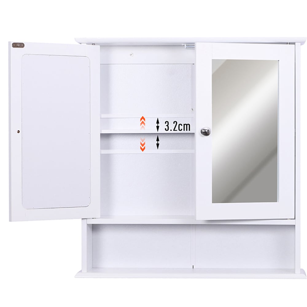 This Mirror Wall Cabinet from Kleankin is a fantastic option for creating extra space in your home bathroom. Made from premium quality MDF board, it is a high-quality addition to your home that is durable and easy to look after. Inside lies a large compartment with an adjustable shelf, allowing you to store medicines, toiletries, bottles, etc, more efficiently, with an open bottom shelf on the outside for extra storage that’s easy to access. The two mirrors are placed on the two doors, allowing you plenty of room to do your make-up or shave, and the two knob handles make the doors easy to open. It’s easy to install. Simply attach it to the wall and go. With a fresh white finish in a classic design, the bathroom storage cabinet looks great in many styles of bathrooms.