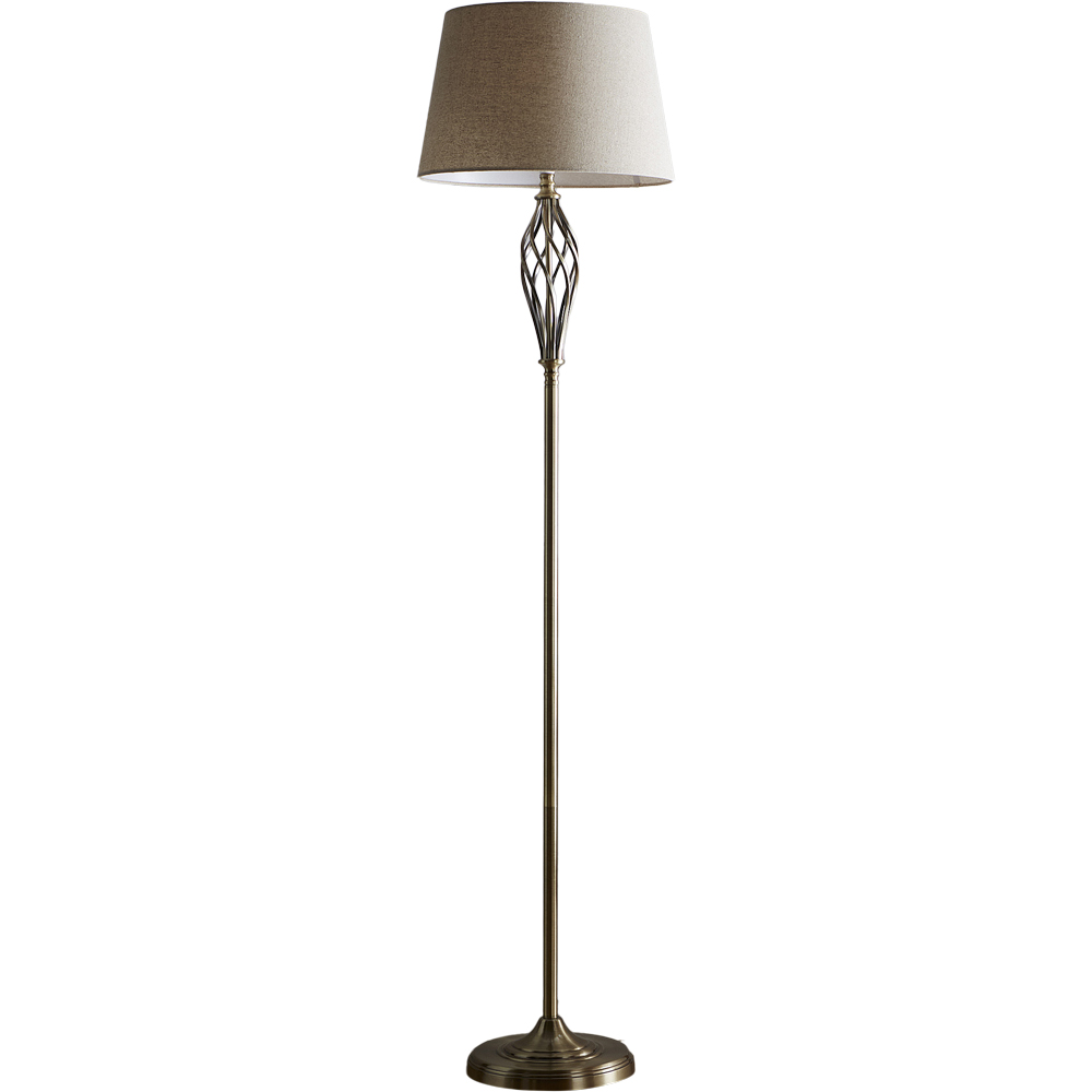 Compton Antique Brass Floor Lamp and Lamp Shade Material: Metal Height of Floor Lamp with Shade: 166cm (65") Tall Height of Antique brass Stem: 135cm (57") Tall Base: 26cm x 3cm All sizes are approximate Shade: Height: 23cm, Width Bottom: 36cm Width Top: 26cm Switch is on bulb holder, cable is Black and comes out of base. Colour/Finish: Antique Brass/ Natural Linen Lampshade Bulbs Not Included, Bulbs required: (BC) B22 60 Watt Max (BC) B22 42 Watt Max Reduced Energy Halogen (BC) B22 11 Watt Max Energy Saver.