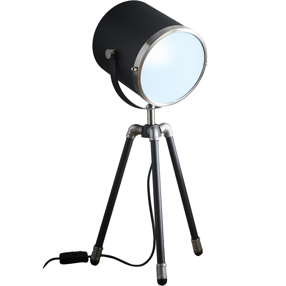 Dagon Black and Satin Nickel Tripod Projector Spotlight Style. This table lamp has an industrial, spotlight-inspired design. The lamp features a cylindrical black shade with a silver rim that resembles a studio or stage light. The shade is mounted on a tripod base with black legs and silver accents, giving it a sturdy, structured appearance. The lamp’s style adds a bold, modern touch to the space, making it an eye-catching piece. It complements the surrounding decor well, adding a touch of sophistication and functionality to the area beside the chair. This lamp would work well in contemporary or industrial-themed interiors. Material: Base: Metal Shade: Metal, Glass Lamp: Dimensions: Total Height 54 cm, Width 28cm approx., Colour/Finish: Black.