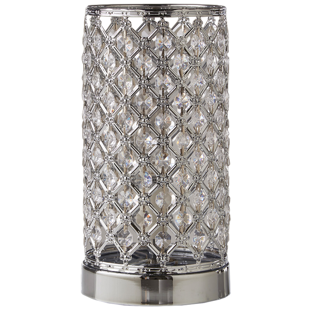 Mikey Beaded Silver Chrome Touch Table LampColour: Silver (Chrome) Clear BeadsMaterial: Metal/AcrylicSize of Lamp: Height: 25cm (10")Width; 13cm (5")Size ApproxE14 Bulbs Required (not included):28 Watt Max Halogen40 Watt Max Filament Golf Ball BulbUK Standard 3 Pin PlugInternational buyers will require a plug adapter to use in their socket.