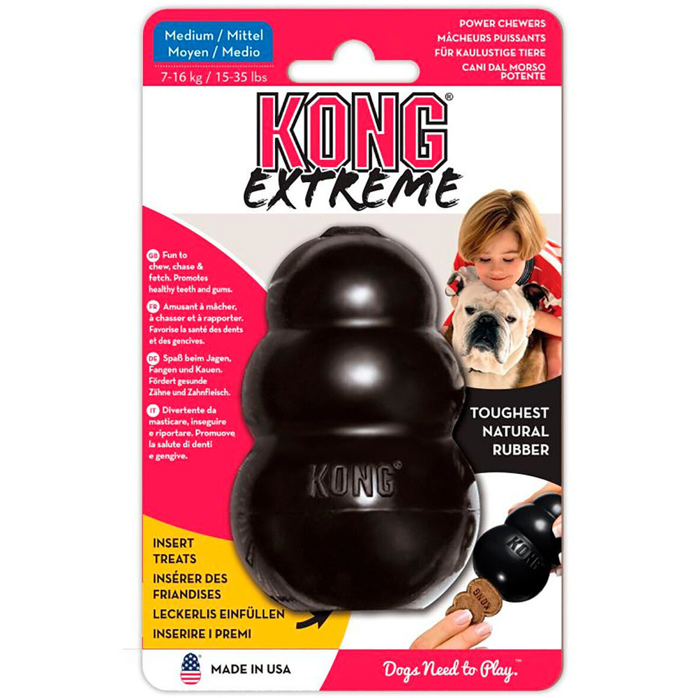 The KONG Extreme dog toy represents the most durable strength of KONG rubber. Designed for the toughest of chewers, the KONG Extreme offers enrichment and helps satisfy dogs' instinctual needs. The KONG unique, ultra-durable, natural rubber formula is designed for determined chewers, while the erratic bounce fulfills a dog's need to play. Want to extend play time? Be sure to stuff with tempting bits of kibble and entice with a dash of peanut butter. Add to the fun by adding KONG Snacks and top with KONG Easy Treat. Stuff and Freeze for a longer-lasting challenge.