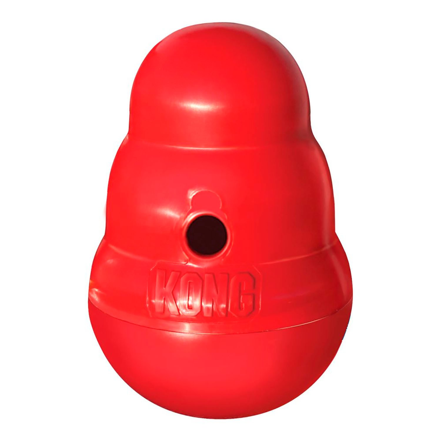 The KONG Wobbler is an action-packed toy that is a mentally stimulating food dispenser. The KONG shaped toy sits upright until nudged by the dog's paw or nose, dispensing tasty rewards as it wobbles, spins and rolls. The unpredictable movement stimulates natural instincts keeping even the most seasoned users challenged. The KONG Wobbler can also be used as an alternative to a dog bowl to help extend mealtime while providing exercise for your dog. Trying to get your dog to lose a few unwanted pounds? The KONG Wobbler is a great way to keep dogs moving while making them work for their food. Unscrews for easy filling and cleaning. Use the large Wobbler for medium to large-sized dogs