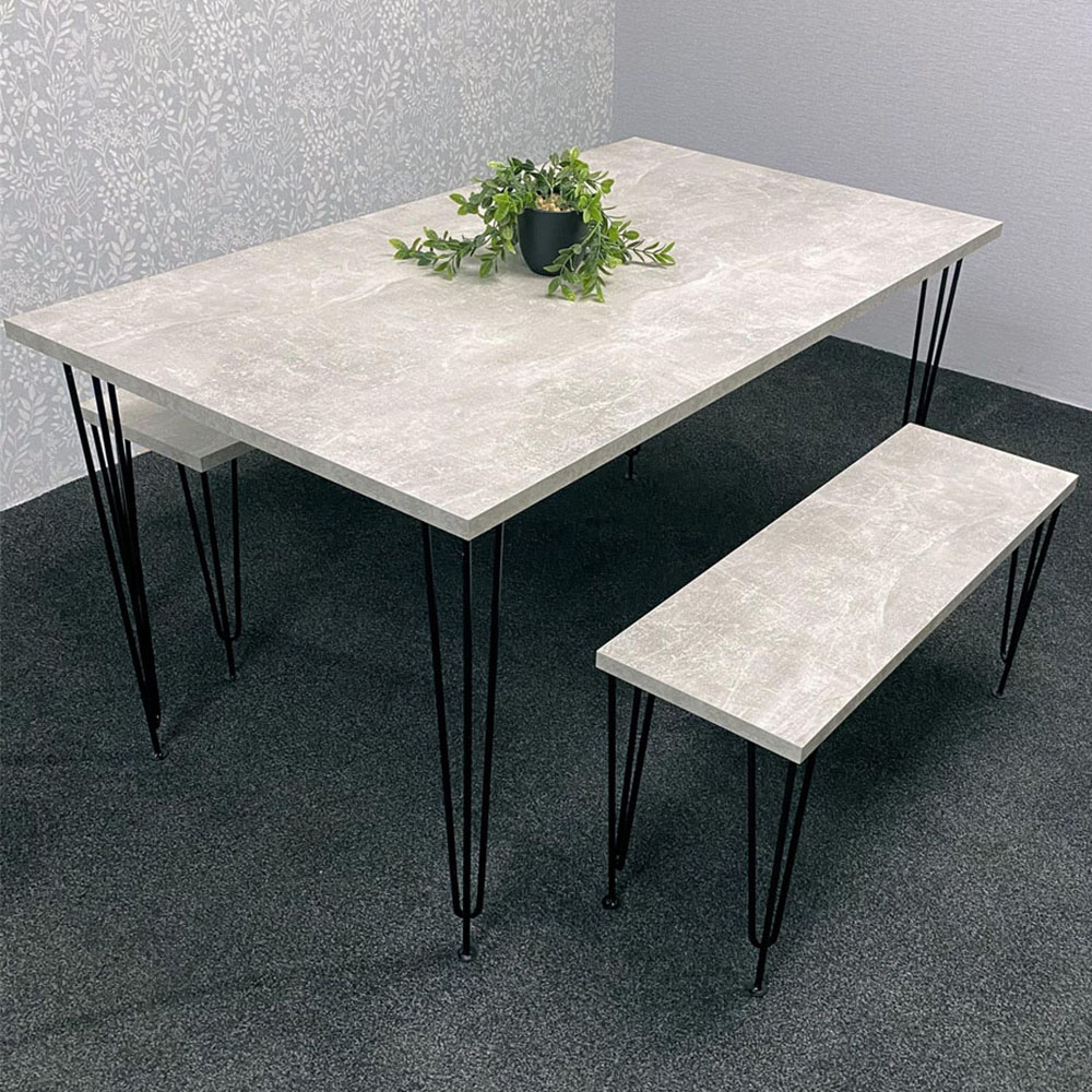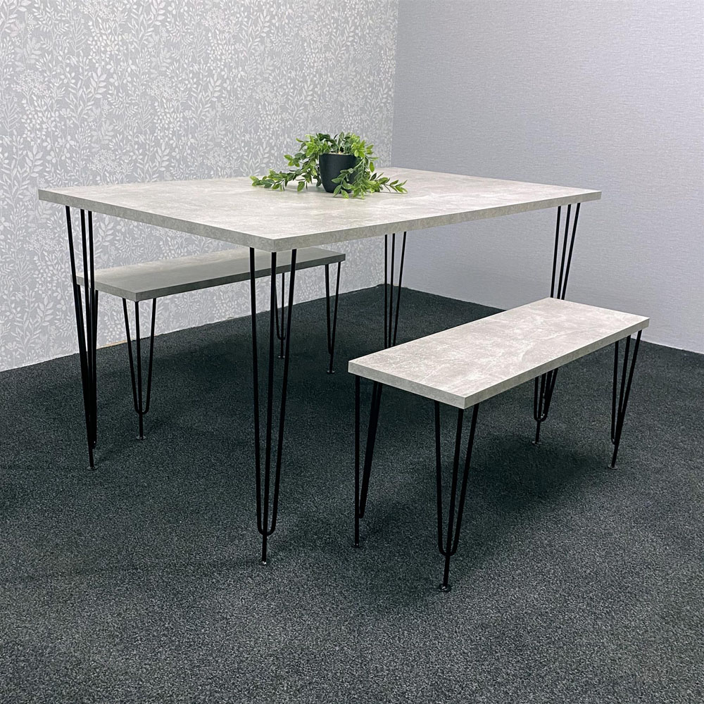 Elevate your dining experience with this sophisticated grey dining table set, complete with hairpin legs that add a modern twist to your kitchen or dining room. The stone-grey effect finish provides a chic look, while the durable melamine-laminated tabletop ensures a long-lasting, easy-to-clean surface. Including two matching benches, this set not only saves space but also offers a cohesive and stylish aesthetic, making it an ideal choice for homes with a contemporary decor theme.