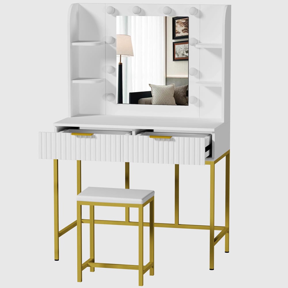 - Features white dressing table with mirror and LED bulbs