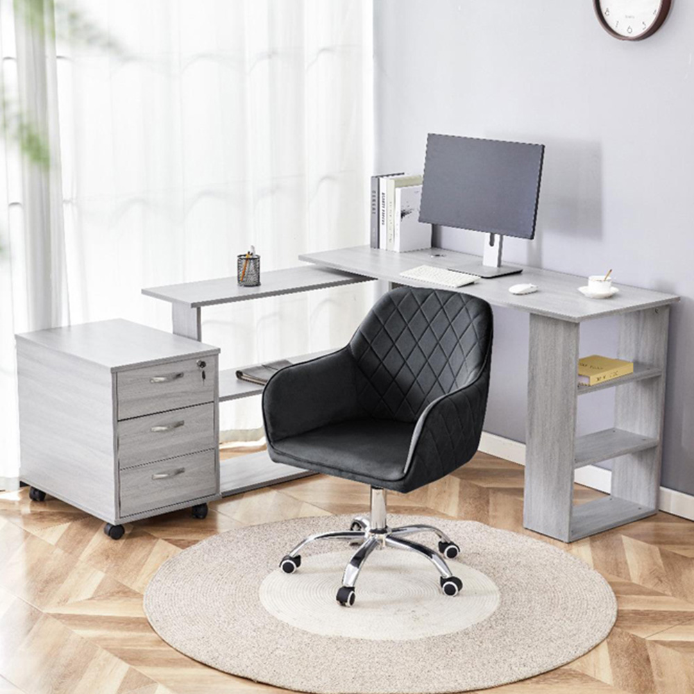Kosy Koala modern office furniture set, designed to combine style, functionality, and comfort. This set includes a sleek grey L-shaped desk, a black velvet-upholstered office chair, and a mobile storage drawer unit. The desk features a durable wooden top with storage shelves. The chair comes with elegant diamond stitching. The chair offers height adjustment and smooth caster wheels for easy mobility and comfort. For added convenience, this set also includes a mobile storage drawer unit, which fits easily under most desks. The drawer unit features three spacious drawers to keep documents, supplies, and office essentials organised and easily accessible. Desk dimensions: H75 x W120 x L140cm. Chair dimensions: H80.92 x W61.5 x L60cm. Adjustable seat height: 42-54 cm. Storage drawer dimensions: H58 x W60 x L42.5cm.