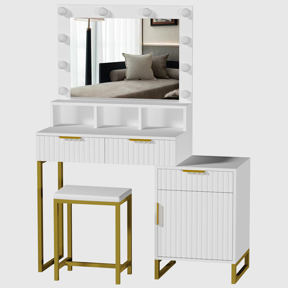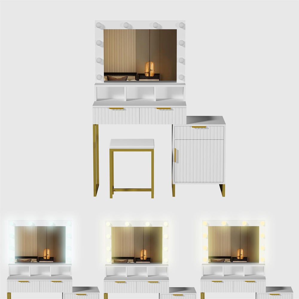 Add elegance and functionality to your bedroom with this white and gold Hollywood-style dressing table set. Featuring a classic bulb-lit mirror, a built-in storage cabinet, two drawers, and a padded stool, this set combines glamour with everyday practicality. Gold handles and legs elevate the look with a modern touch, while the spacious layout keeps beauty essentials neatly organised. Perfect for styling, makeup, or daily prep, the wide mirror with bulbs provides excellent visibility, bringing a professional vanity feel to your home. Includes a dressing table with mirror and built-in lighting, two drawers, open cubbies, a side cabinet, and a matching padded stool. Features a wide mirror with built-in bulbs for enhanced visibility while applying makeup or getting ready. The lighting is adjustable with three tone options, from cool white to warm. Functional drawers, open shelves, and a side cabinet provide ample space to organise cosmetics, accessories, and beauty tools. Easy Assembly - Hassle-free setup with clear instructions included.