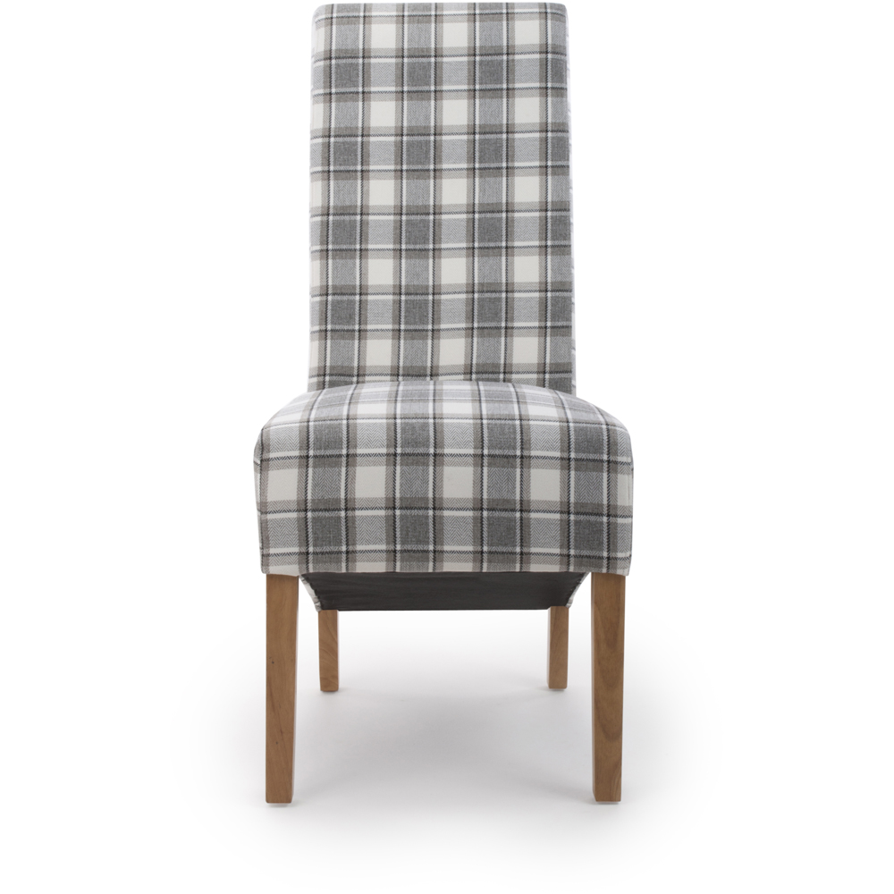 Add a touch of elegance to your dining room with the Krista Herringbone Check Cappuccino Roll Back Dining Chair. This set of two timeless and fully assembled dining chairs has a classic roll-back design. It comes upholstered in cappuccino herringbone fabric with a sprung and belted seat for added comfort. The chair also comes with natural rubberwood legs that perfectly complement the upholstery. Sold in boxes of two, it makes for a perfect addition to any dining room.