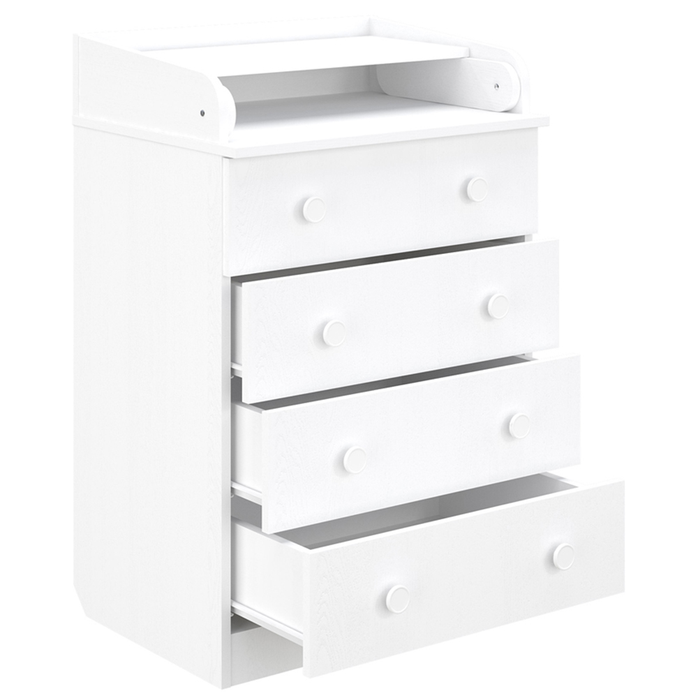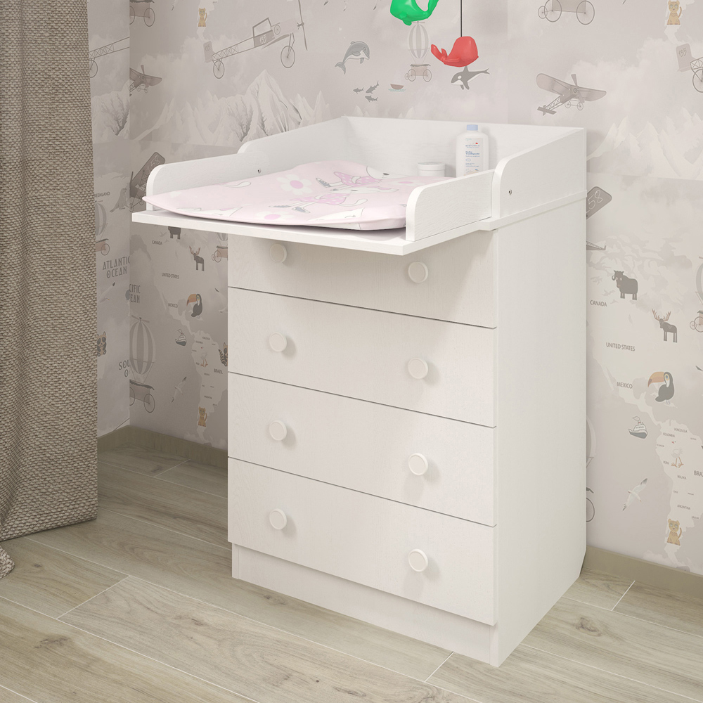 Enhance your nursery with the Kids 600 changing table in white, a stylish yet practical piece that combines ample storage with essential safety. This changing dresser not only provides a generous changing area but also features four spacious drawers, ensuring all your baby's necessities are within easy reach. Crafted from high-quality Kronospan chipboard and adhering to EU safety standards, this versatile furniture can transition to a regular dresser after the baby years, making it a lasting addition to your home.