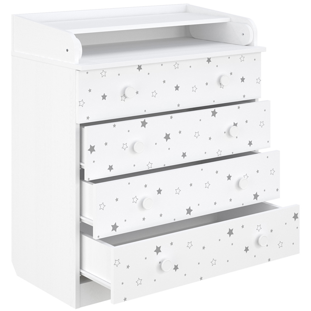 Elevate your nursery's functionality and style with the Kudl 800 Kids 4 Drawer White Starlight Dresser with Changing Board. This dresser not only offers a practical solution for baby care but also adds a touch of elegance to any room. Featuring a foldable changing mat that transforms into a spacious chest of drawers when not in use, it's designed to grow with your child's needs. The four large drawers, equipped with guide rails for smooth operation, provide ample storage space to keep essentials organised and within easy reach. Crafted from environmentally friendly materials, including MFC chipboard and high-quality paint, this dresser ensures durability while maintaining safety with its high side parts and compliance with European standards DIN EN 716: 1.