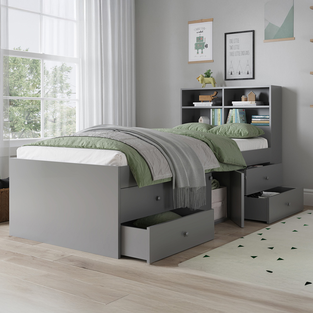 Maximise your space and keep your room tidy with the Kudl Captain Single 2 Door 4 Drawer Grey Cabin Bed with Bookcase Headboard. This cabin bed is a stylish solution to your sleeping needs, offering a sturdy frame with ample storage space. It includes three different compartments, two side drawer areas, and a front section with doors to neatly tuck away clutter. The bookcase headboard provides additional space for books, decor, and other essentials, making it a fantastic choice for modern, compact living.