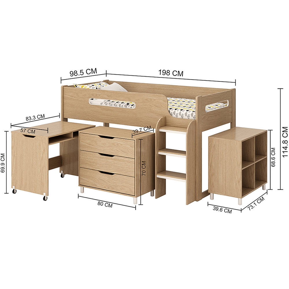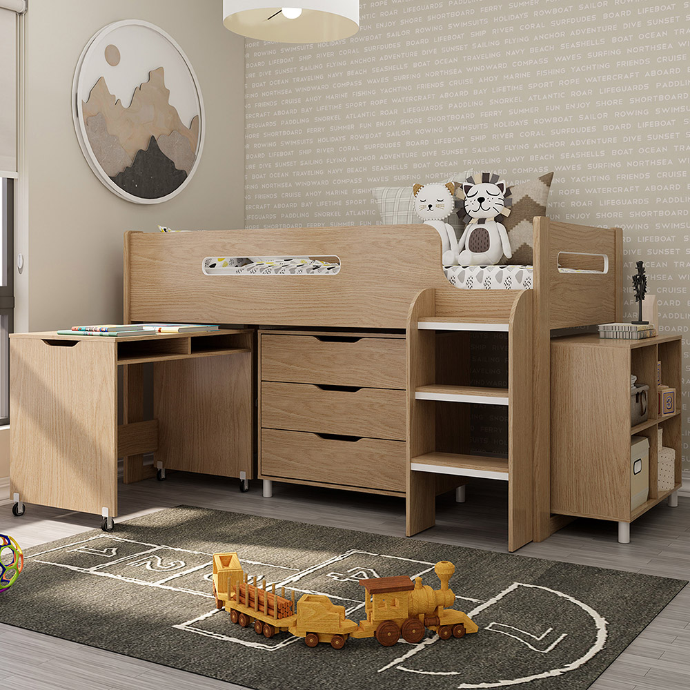 Let your little one sleep up high surrounded by their favourite belongings in this mid-sleeper bed, which unites fun and functionality! Available in oak to suit any décor, the bed also features an integrated desk, drawers and a bookcase providing plenty of storage space for books, toys, games, clothing, and more. The pull-out desk is on wheels and offers space for your child to learn, create and play with a bookcase on the end for more storage.