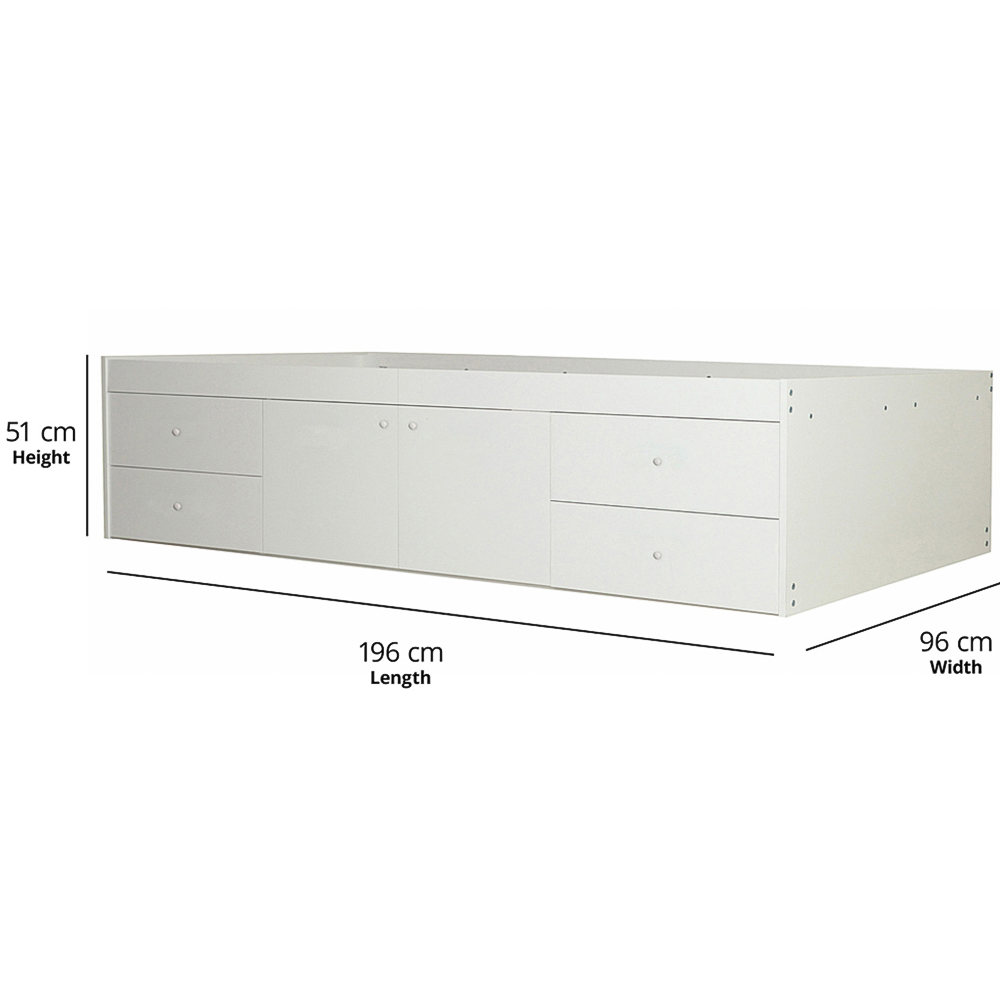 Kidsaw Captains single cabin bed is the perfect answer to your sleeping needs. A single bed frame with plenty of storage, four drawers and one middle cupboard compartment to hide all the messy bits.