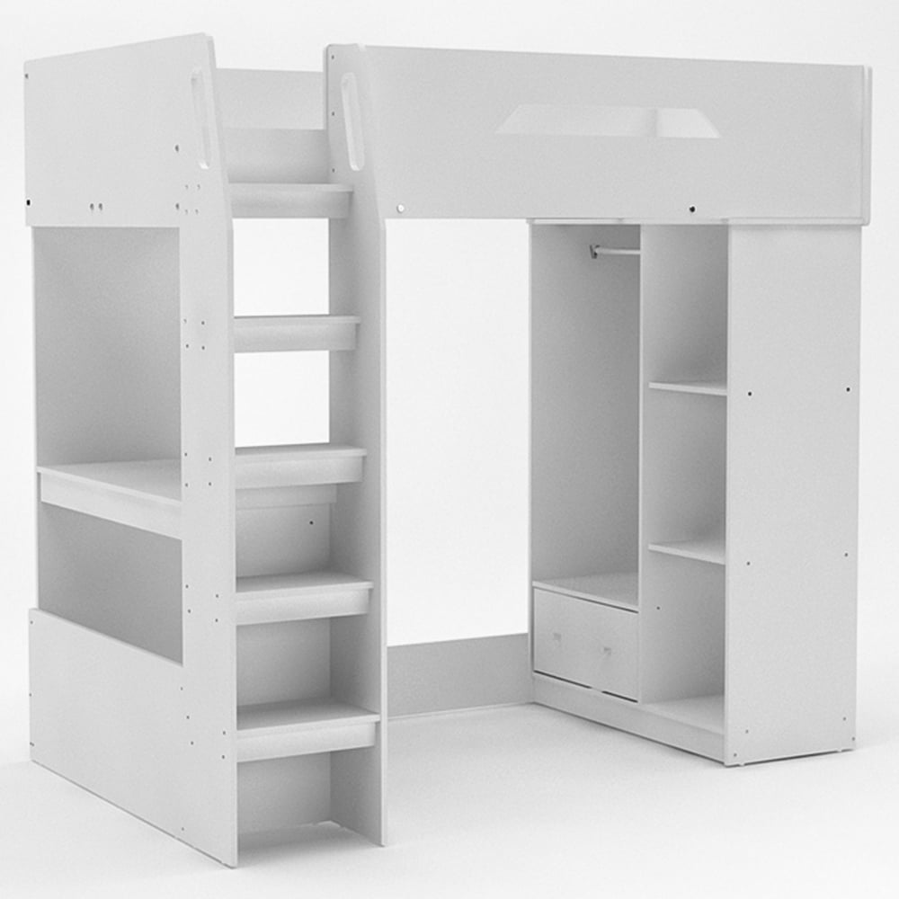 The high sleeper is the ultimate functional bedroom furniture for kids and teenagers. Finished in white, the bed features an incredibly practical hanging area with an integral storage drawer, which really maximizes the space available within its compact footprint. To the side of this is a tall three shelved area with enough room for ample items. The fitted desk on the other side is an ideal work station for your child to work at. The robust ladder is located at the front of the bed with grip handles at the top for when climbing up.