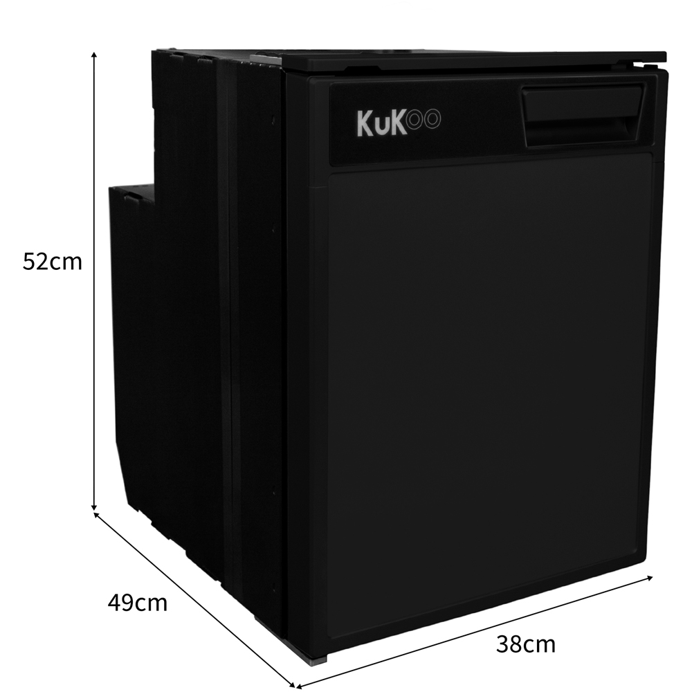 Combining style and functionality, this 46.5L compressor fridge freezer has everything you need to give you all the at-home luxuries while on the road. The sleek black finish will perfectly integrate into your camper kitchen while providing incredible durability and protection for years to come. Although a compact design, the unit is composed of an impressive 42L fridge and 4.5L freezer, offering you plenty of storage space for all your groceries. Designed with practicality in mind, there’s a compartment to suit all shapes and sizes of products. A generously sized door pocket is perfect for your bottles, keeping them secure and upright throughout the journey. Smaller, more fragile items, such as eggs, can be safely kept in the compartment above, which is shielded by a plastic guard. Keeping fruits and vegetables fresh is no problem in this compressor fridge thanks to the large crisper draw to the bottom. A further two shelves fill the main section, providing sufficient adjustable storage while helping to keep your fridge area organised. Benefitting from a freezer compartment, it gives greater flexibility in what items you can take on the road with you. Includes a 24-section ice cube tray. Although extraordinarily spacious already, if you wish to increase the fridge section even more, the freezer can easily be removed, turning the unit exclusively into a fridge. To further enhance the functionality of this compressor fridge, the unit can accommodate either a left- or right-hand door opening depending on your campervan's interior, thanks to the convenient door hinge on both sides. The highly efficient Cubigel compressor quickly and effectively cools the fridge freezer for optimum performance despite its incredibly low energy consumption. Although extremely powerful, this compressor fridge is remarkably quiet with a noise output of 42dB at 1m, which helps to maintain a pleasant living environment. Operating the unit is made easy with the addition of an LED display control panel. Adjust the fridge temperature to a maximum of 5°C and -18°C for the freezer to create the perfect climate. This intelligent control panel also features an integrated light for improved visibility of what’s inside your refrigerator. While the fridge freezer is suited to use 12 and 24V DC power, it can also connect to 100-240V AC power with the addition of an adaptor. For optimum safety and protection of the battery, the fridge features an automatic cut-off if the voltage is insufficient. Whether for a motorhome, caravan, campervan, or boat, this powerful 46.5L fridge freezer is the ultimate kitchen upgrade for keeping your food fresh while on the go.