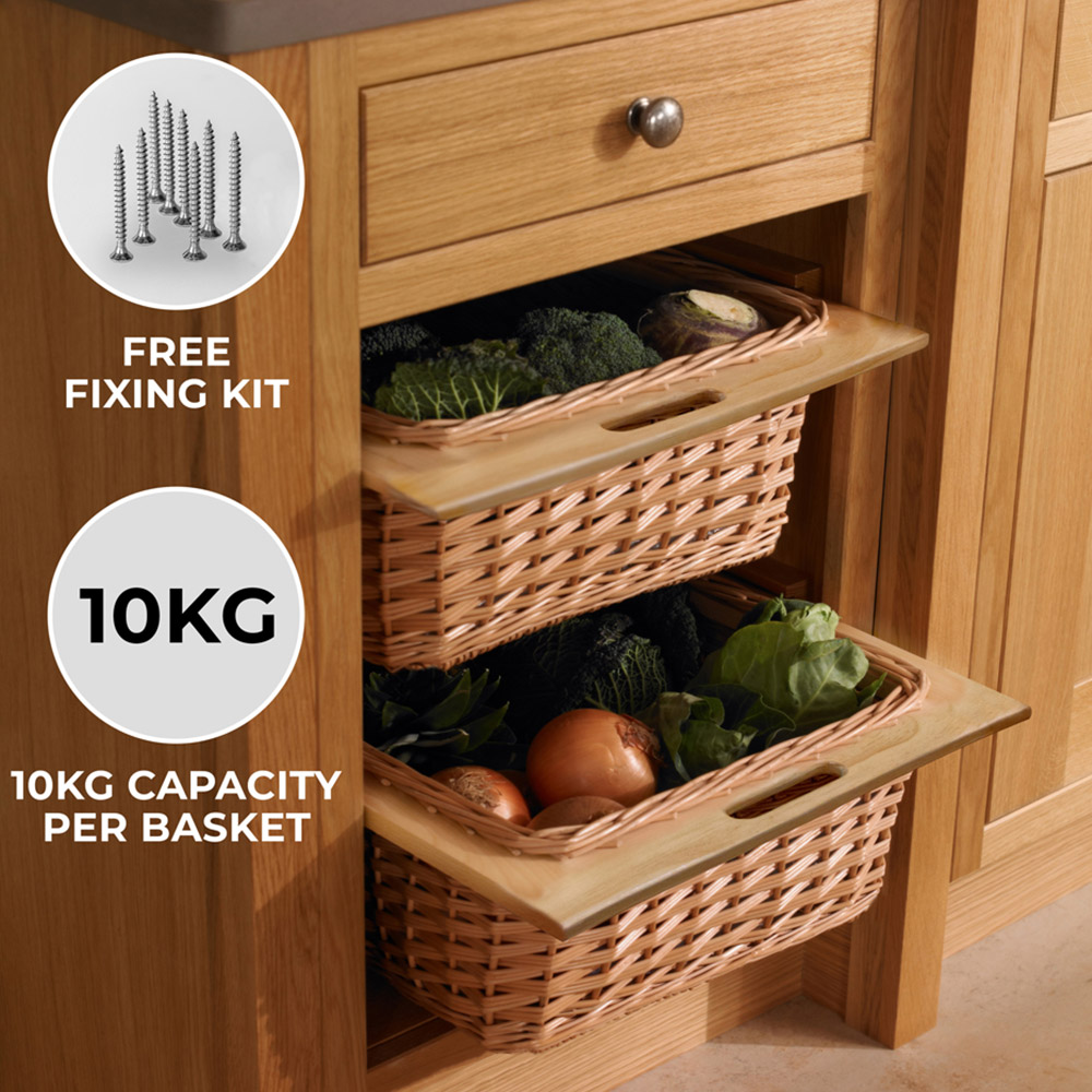 Organise your home or kitchen with Kukoo Brown Beech and Rattan Wicker Kitchen Basket 2 Pack. These handwoven wicker baskets provide a rustic twist on storage, perfect for a country farmhouse-style kitchen. Offering extremely practical storage, these baskets are ideal for kitchens, bedrooms, dining, or utility rooms for a variety of uses. Due to the wicker design, the air can easily circulate, therefore preserving the life of fresh produce. Made from high-quality beech and rattan, these baskets are light in weight and very durable yet strong enough to accommodate up to 10kg per basket. The pre-drilled beech wood runners and frame with integrated handles make them easy to access in open display cabinets. Includes a fixing kit. Size: 51 x 52 x 21cm.