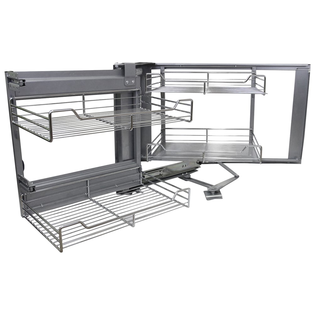 Improve your kitchen, utility room or workshop with these durable corner storage baskets. Made to fit inside a blind corner unit, they help to maximise storage in smaller spaces. Maximise all available storage space in your blind corner kitchen cupboards with a set of metal pull-out baskets. This practical storage solution prevents you from struggling to get those items at the back of the cabinet and is perfect for narrow kitchens, ensuring that no space goes to waste. Stainless steel soft close blind corner storage baskets - choose from left or right quantity. Made to fit a blind corner cabinet, between 900-1000mm wide is ideal. Four stainless steel baskets provide plenty of storage space. Each basket has a capacity of 15-20kg. The pack includes back frame, articulated arm, door pivot, top plate, side frame, door connector, rear and door storage baskets, screws, brackets & rubber rings. Cabinet requirements: Minimum height: 530mm, Minimum depth: 480mm, Minimum width: 860mm. It is recommended you have a drill, pencil, tape measure, ruler and screwdriver to hand when installing these pull-out baskets.