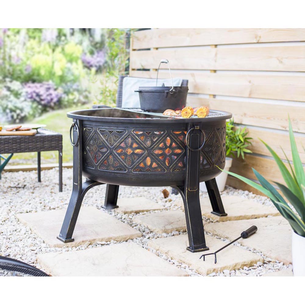 Create a warm atmosphere in your garden with this Moresque Moroccan style fire pit. The Moresque firepit creates North African vibes in your outdoor space. Inspired by traditional Moroccan art, it features an intricate pattern around the fire bowl producing soft shadows in low light. The firepit includes a large chrome-plated cooking grill, log grate, mesh lid and safety tool. Relax by the flames under the stars or utilise the cooking grill to create Moroccan style food, taking yourself and your guests away to a land far, far away. The fire pit features a bronze effect high-temperature paint finish. Pair it with some of their Moroccan style lanterns to really enhance the North African vibe and make your social gatherings truly unforgettable.