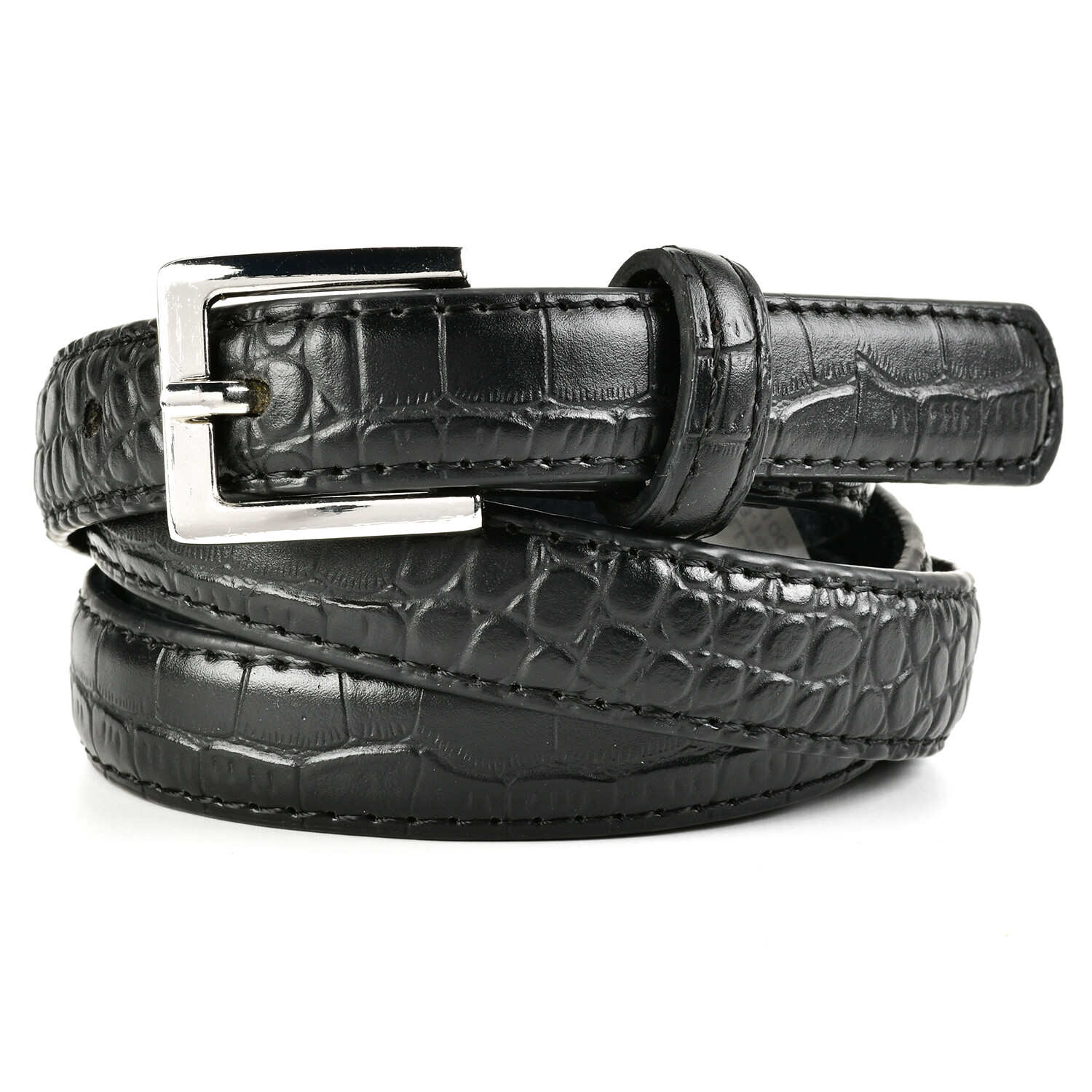 An extremely thin belt featuring pitch-black leather with a snake-skin effect, the Ladies Snake Skin Belt will bring a lavish and voguish touch to any outfit. With a small silver-effect buckle that perfectly compliments the black leather, this belt will look fantastic paired with casual and more formal outfits alike.