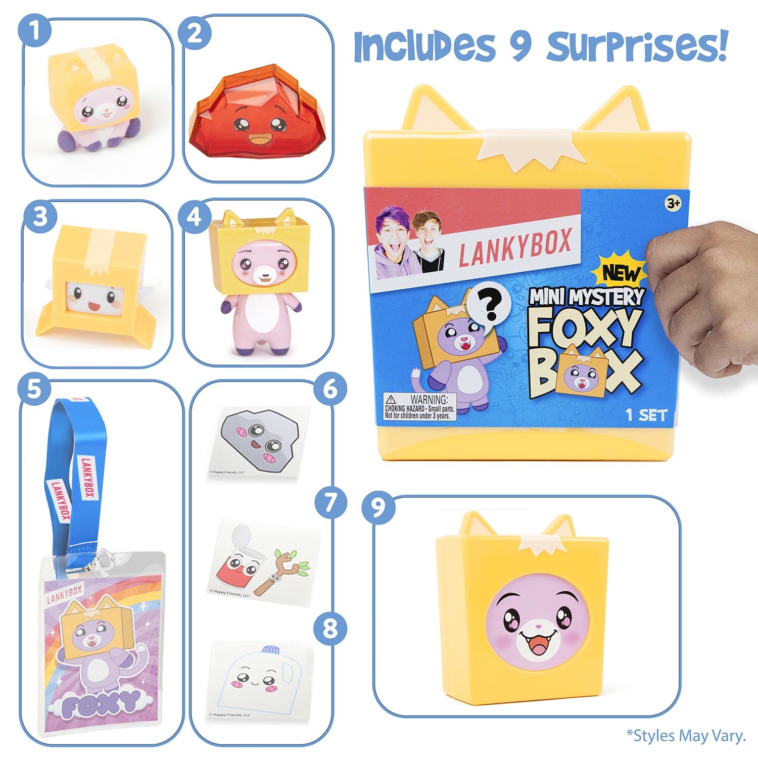 LankyBox, the most highly viewed YouTube gaming duo in the world, features stars Justin and Adam and their cast of animated characters, including Boxy, Foxy, and Rocky. They create high-energy, laugh-out-loud videos, including challenges, gaming and shorts. The all-new Mini Foxy Mystery Box is here for LankyBox fans who can't get enough of the wildly popular YouTube channel! The set is filled with new incredible collectables, making it the ultimate surprise unboxing experience. It contains figures, a squishy figure, a lanyard with a mystery charm that can only be found in this set, and stickers! The case even doubles as a collectable version of Foxy! All of the contents capture the high energy and creative charisma of the LankyBox videos. This Mini Foxy Mystery Box is officially licensed LankyBox merch and will surely be a big hit for boys and girls worldwide.