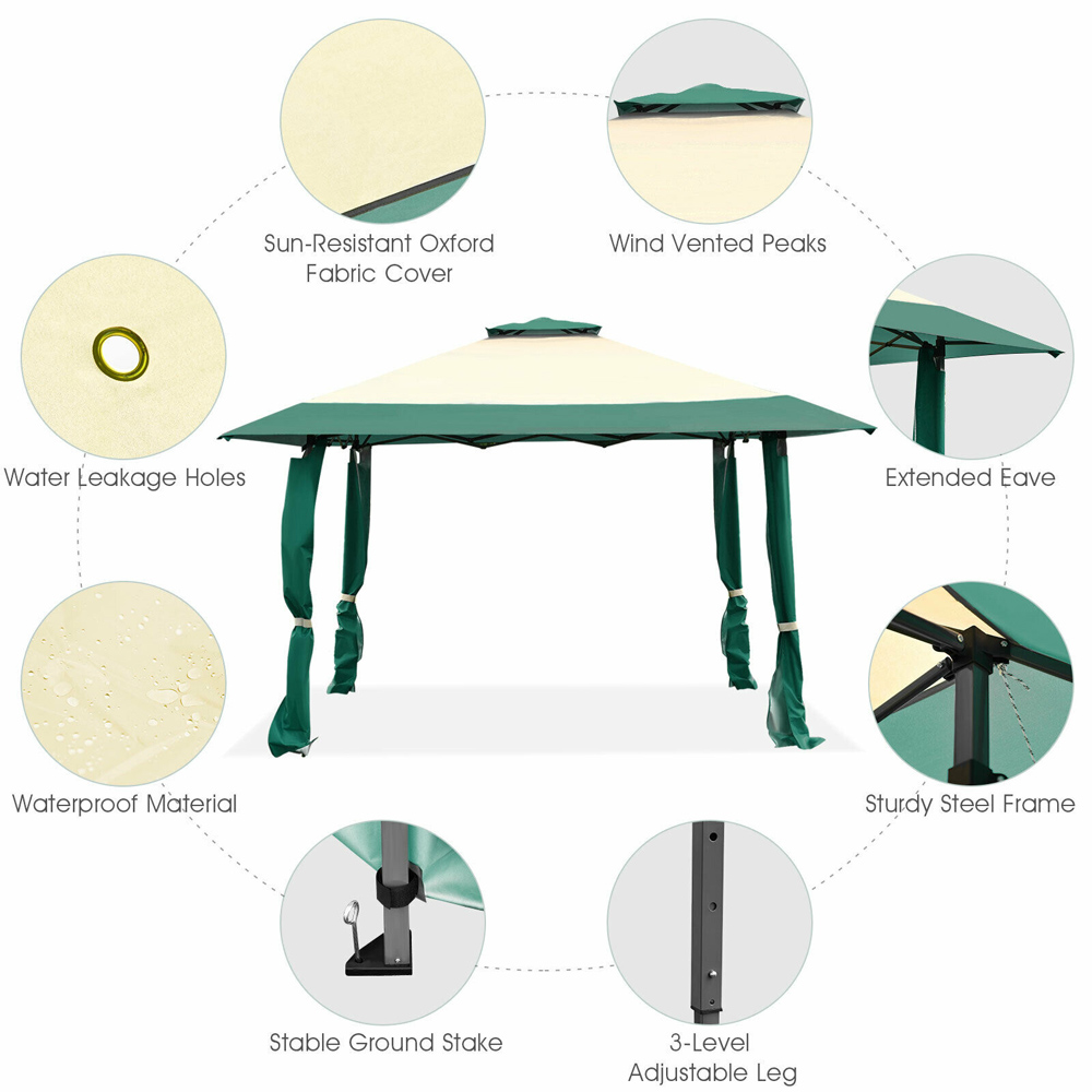 This Costway Green Large Adjustable Height Gazebo Canopy is an excellent choice for gatherings with family or friends, featuring a double-ventilated roof for proper airflow and three adjustable heights ranging from 267cm to 284cm. Made from premium Oxford fabric and powder-coated steel, it is durable and sturdy enough to withstand bad weather. The tent is easy to set up and fold, and it comes with a wheeled storage bag for effortless transport and storage. Ideal for parties, picnics, and trade exhibitions, this versatile canopy tent provides large shade coverage and is a great addition to your yard, park, or flea market.