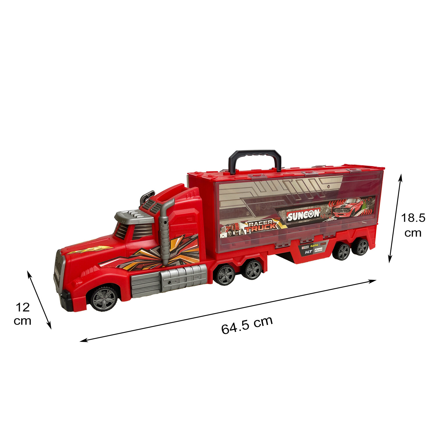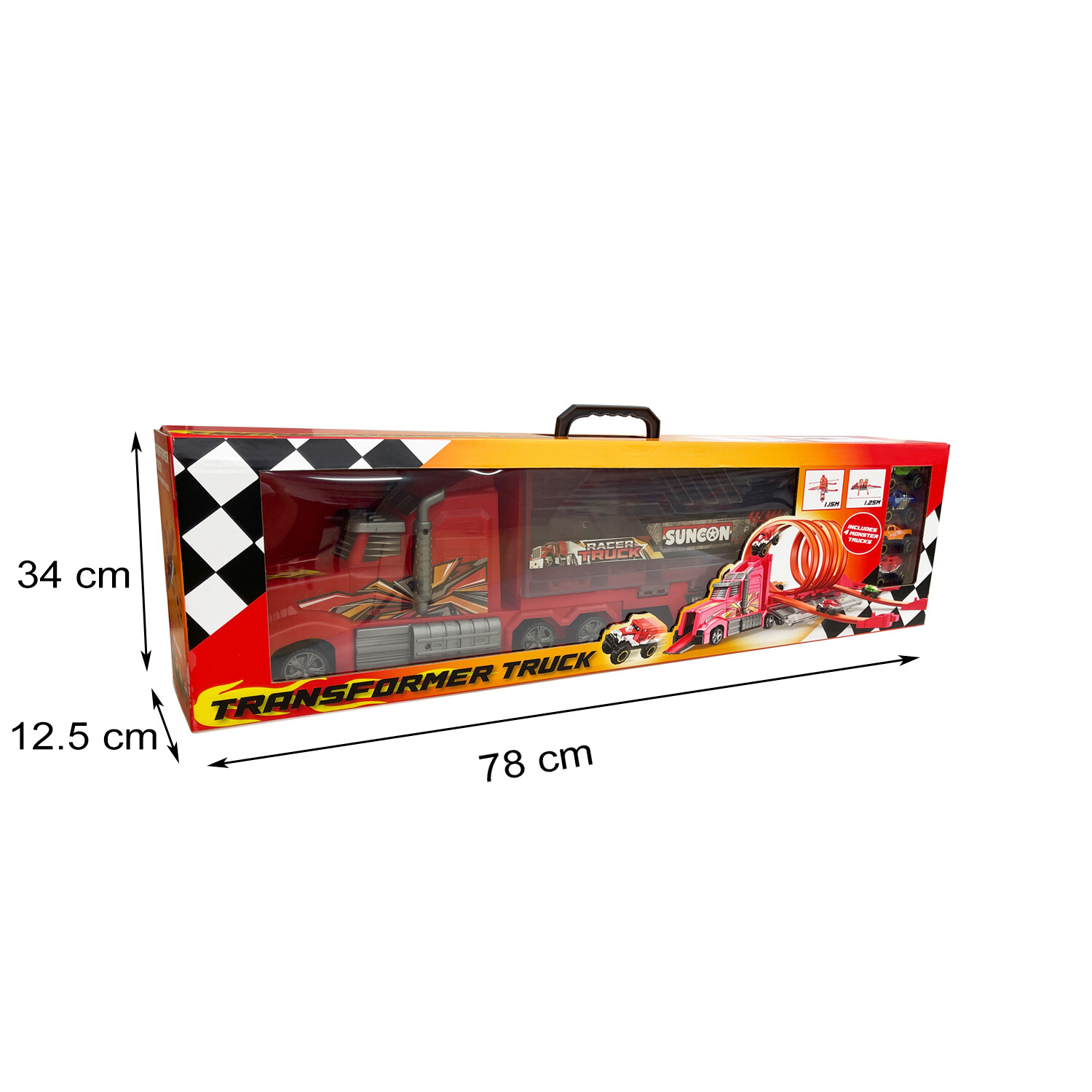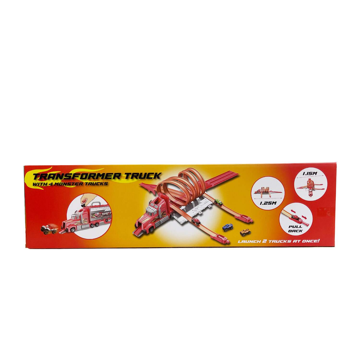 Engage in some racing action with the Large Transformer Truck. Featuring a unique design, this truck has a car body track with two circular tracks that can easily be assembled or disassembled. The tracks are equipped with handles and a handy storage function so you can carry your cars along conveniently. It comes with four small plastic cars, allowing you to start playing right away.