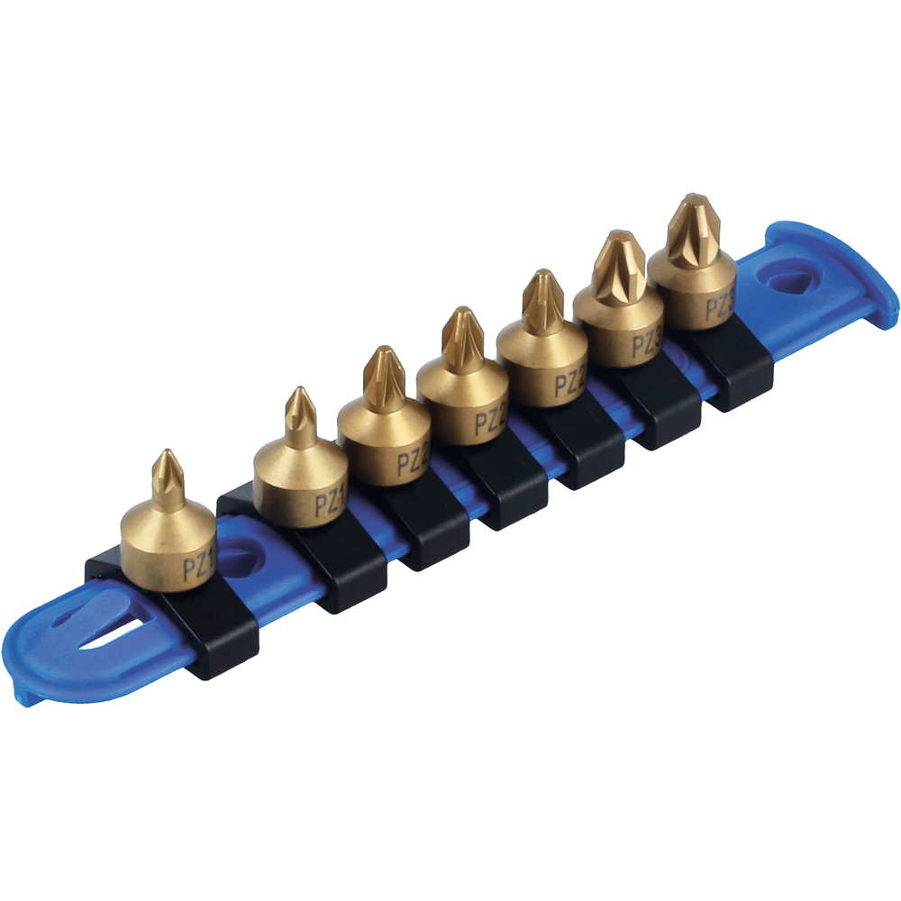 This seven piece 1/4"D bit set comprising of low profile Pozi drive bits ideal for use in confined areas and hard to get to fixings. The bits are manufactured from S2 steel with a titanium finish and are supplied on plastic storage rail.