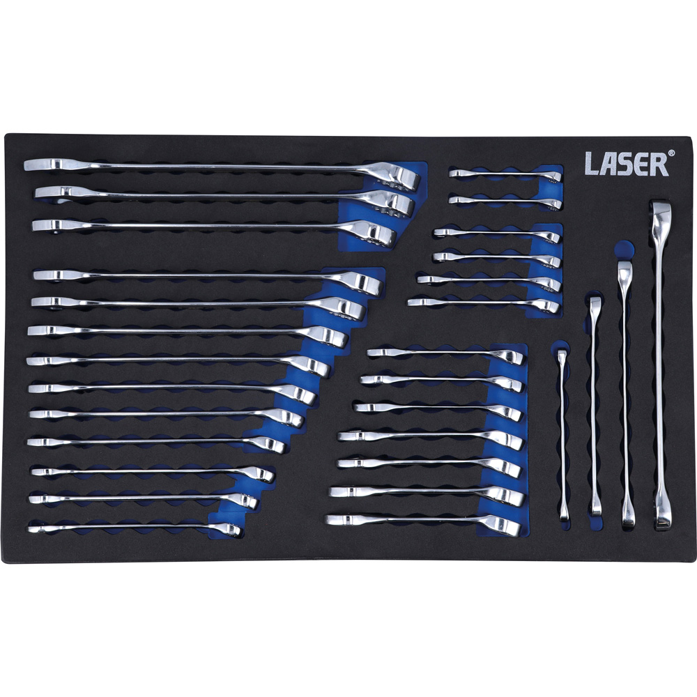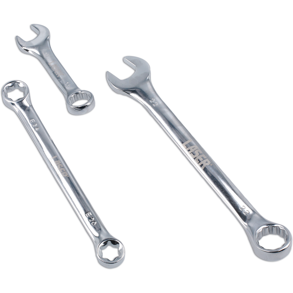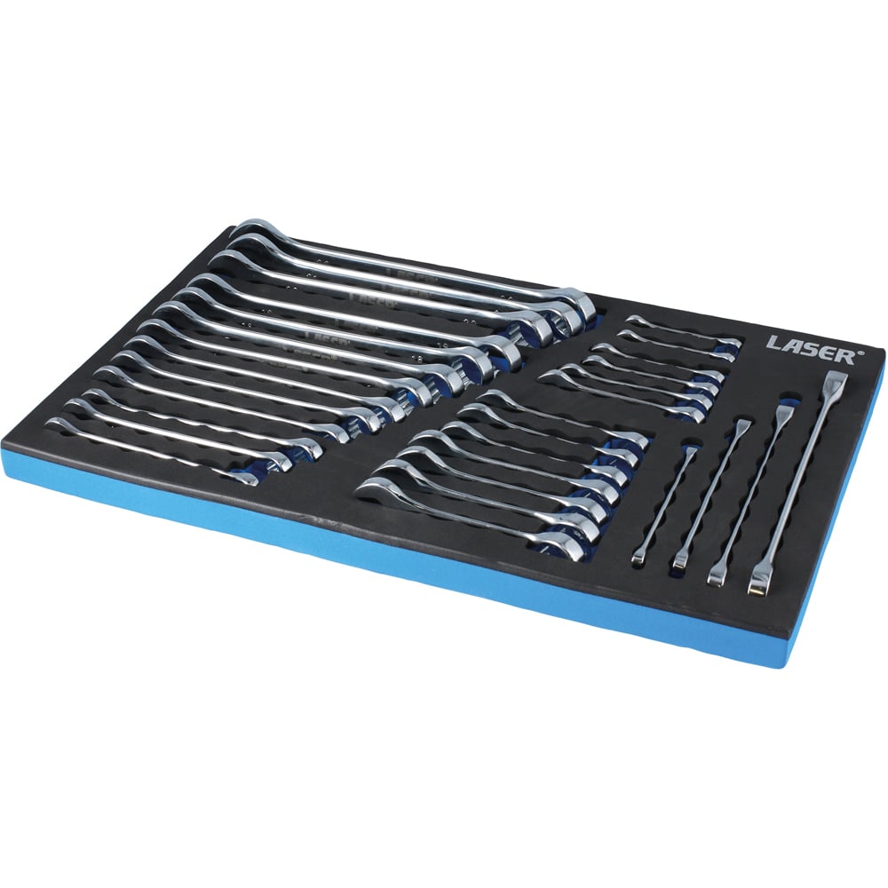 A comprehensive metric spanner set in both regular and stubby lengths, which also features a set of double ended profile spanners from E6 to E24. The spanners are manufactured from chrome vanadium and have a mirror polished finish. They are supplied in an EVA foam tray, designed to fit roll cab drawers, keeping the tools clean, tidy and ready for use. The 30 piece set is a great tool kit for the home mechanic since it contains a useful selection of the most sizes, covering the most common applications in the workshop.