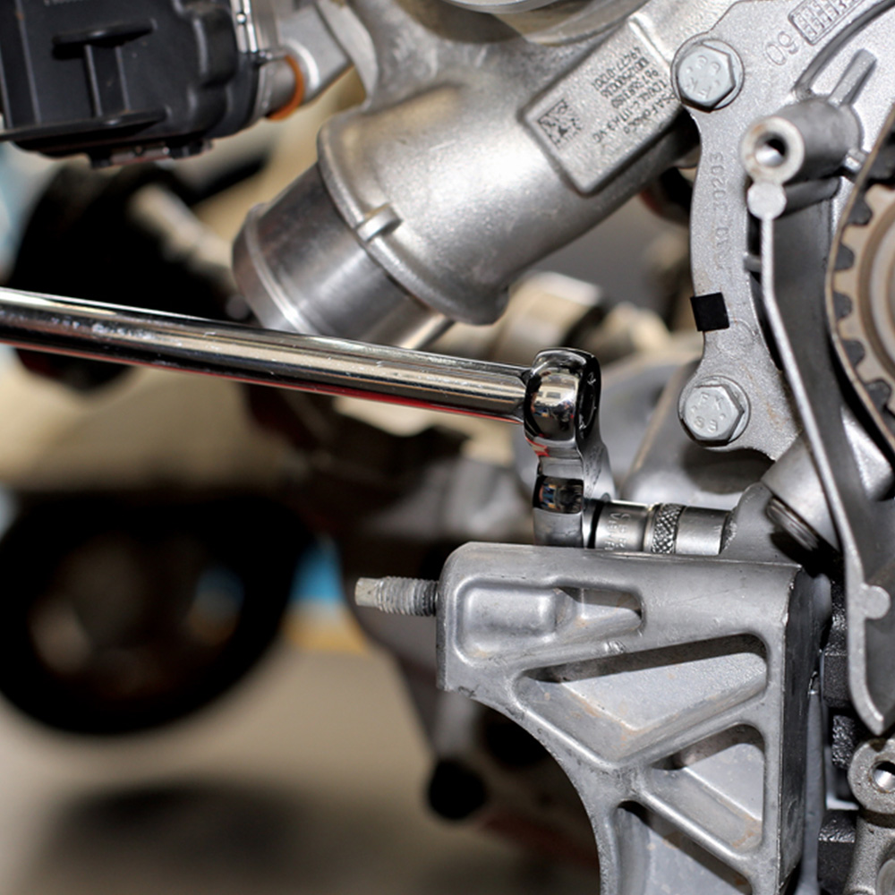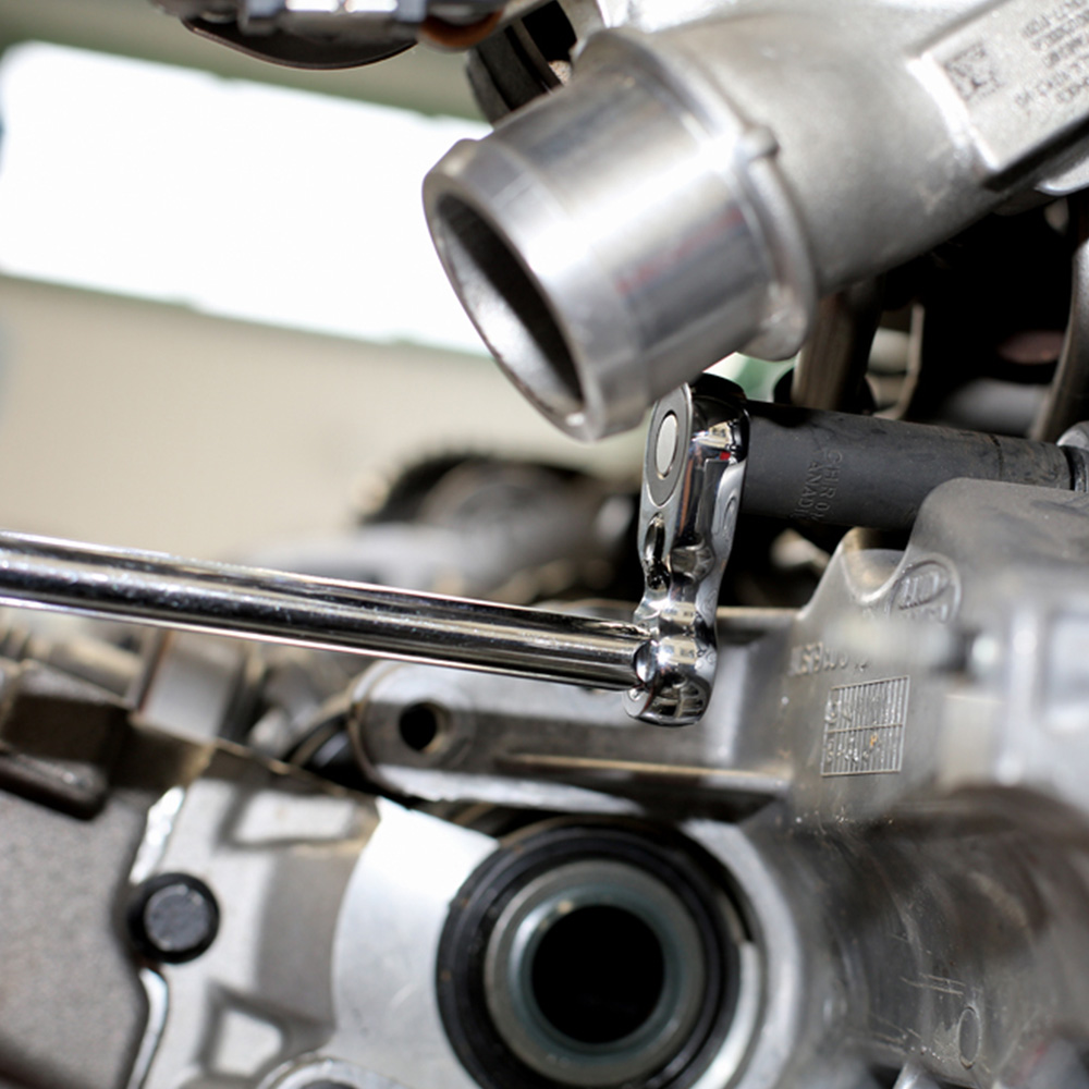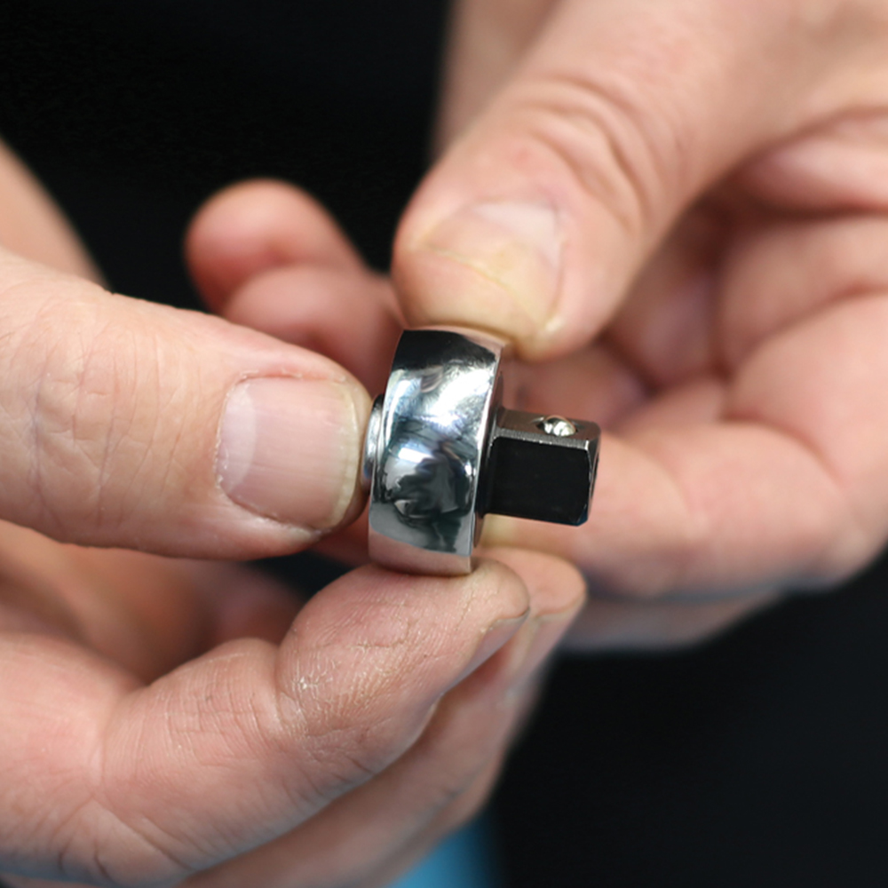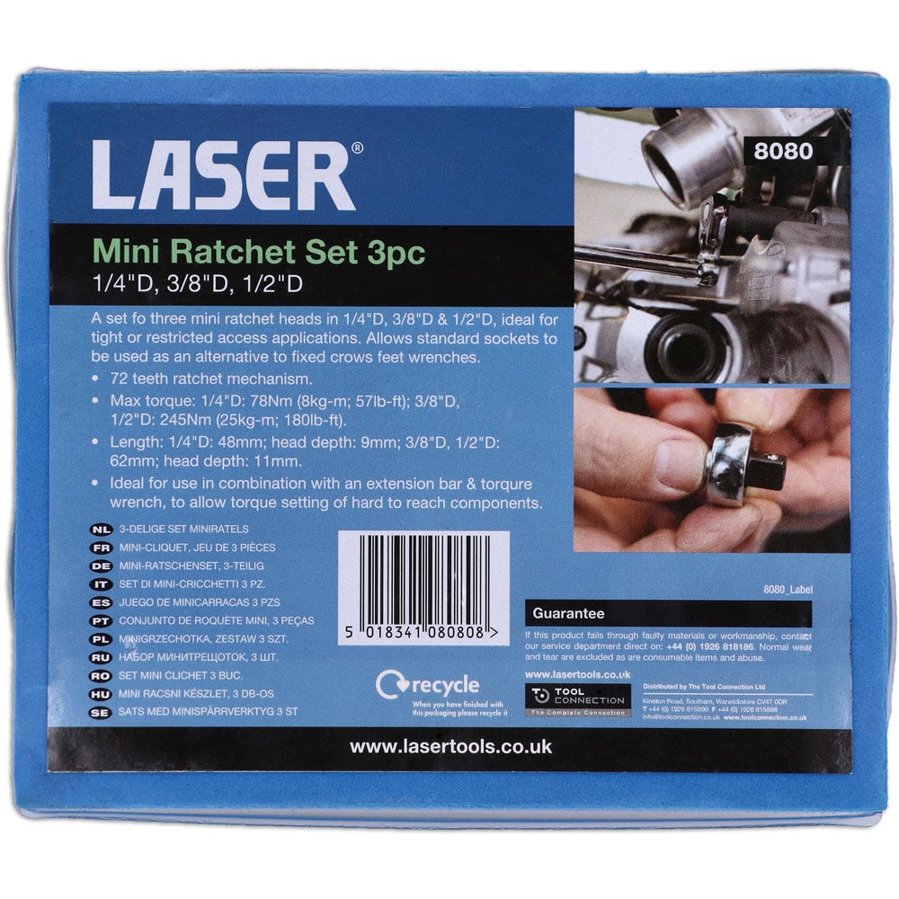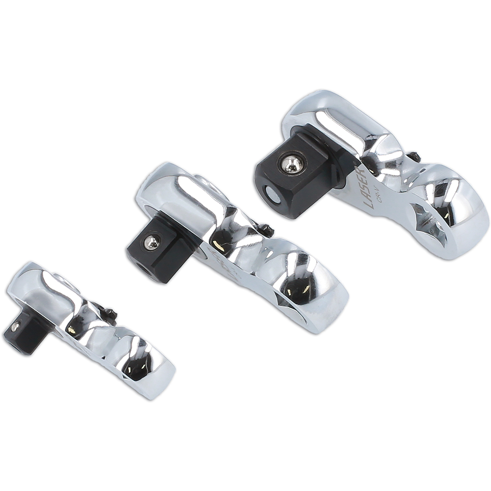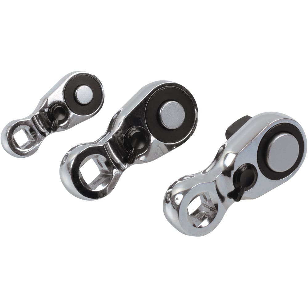A set of three mini ratchet heads in 1/4"D, 3/8"D and 1/2"D, ideal for tight or restricted access applications. Allows standard sockets to be used as an alternative to fixed crows foot wrenches.