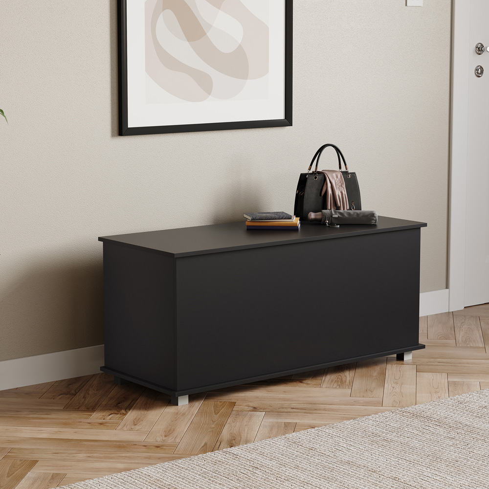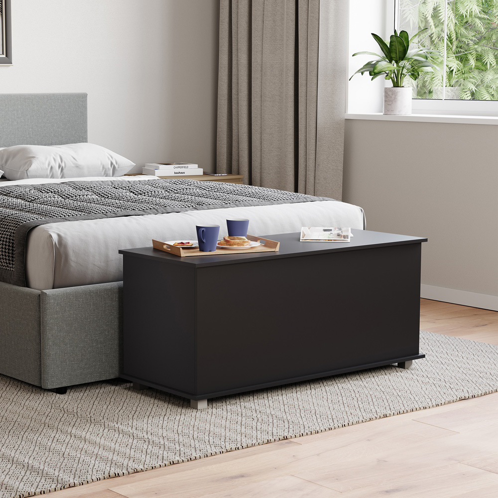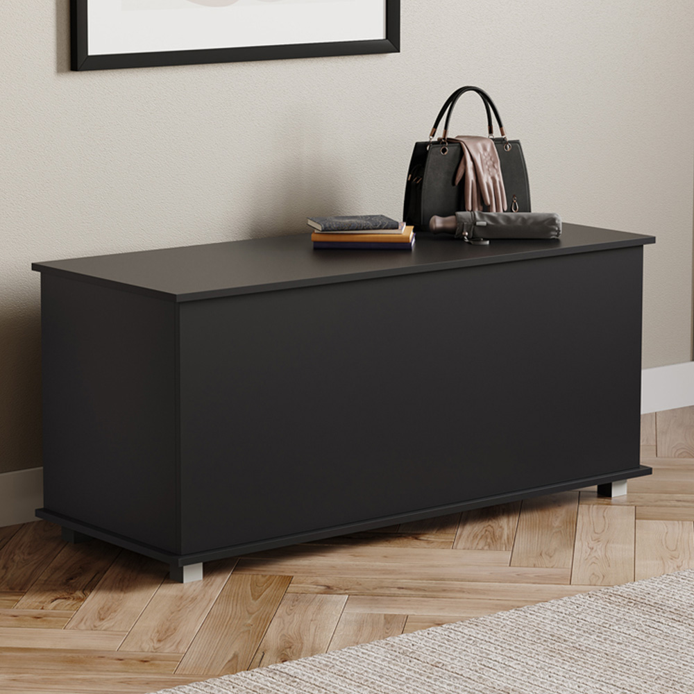 Introducing stylish Vida Designs Leon Wooden Storage Ottoman in black, the perfect blend of practicality and elegance. Crafted from high-quality wood, this ottoman offers a spacious interior for storing blankets, pillows, or other items. The sturdy construction ensures durability, while the wood finish adds a touch of warmth to your decor. Use it as a footrest, extra seating, or as a coffee table with a serving tray on top. This versatile wooden storage ottoman is a functional and attractive addition to any living space. Dimensions: H46 x W100 x D40cm.