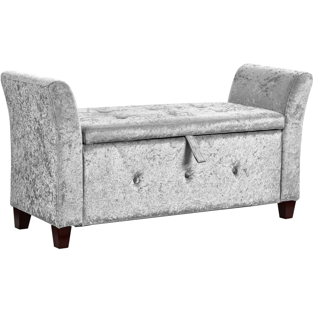 Introducing Home Vida Seville Crushed Velvet Silver Storage Ottoman, a perfect combination of style and functionality. This ottoman is designed to declutter your space while adding a touch of elegance. The spacious interior provides ample storage for blankets, pillows, or other items. Its sturdy construction ensures durability, while the fabric upholstery adds a cosy and inviting feel. Use it as a footrest, extra seating, or as a coffee table with a serving tray on top. This fabric storage ottoman is the ideal solution for optimizing space and enhancing your home decor. Dimensions: H60 x W120 x D45cm.