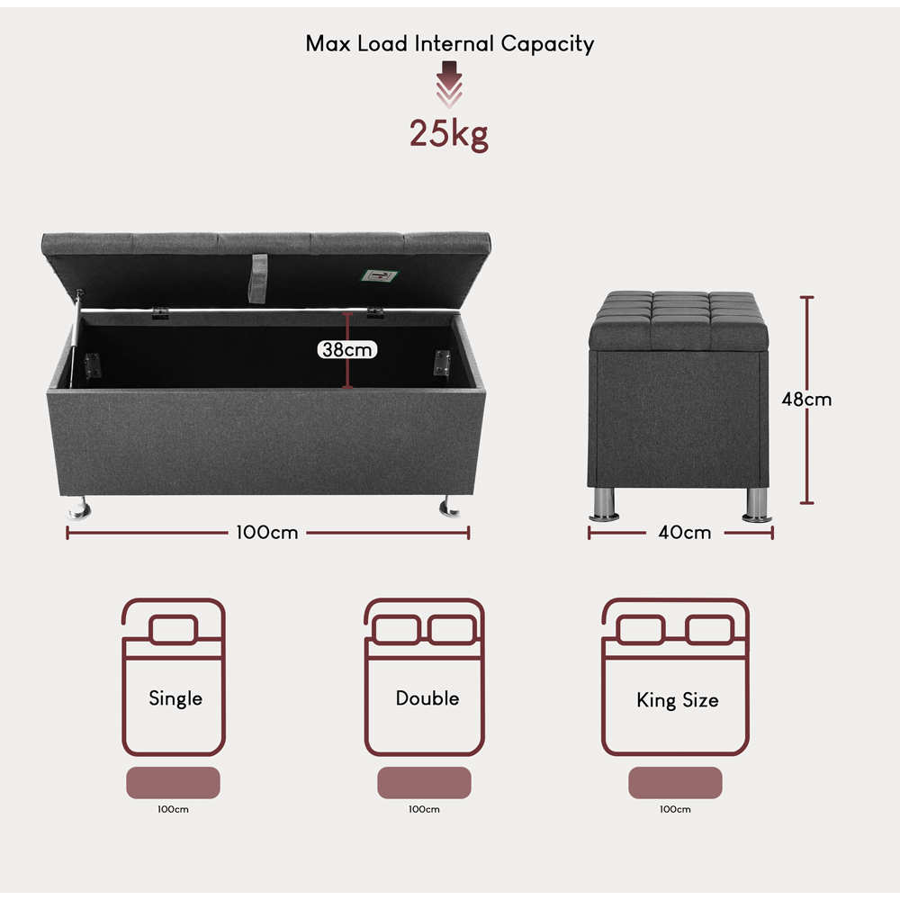 Introducing Home Vida Valencia Dark Grey Linen Storage Ottoman, a perfect combination of style and functionality. This ottoman is designed to declutter your space while adding a touch of elegance. The spacious interior provides ample storage for blankets, pillows, or other items. Its sturdy construction ensures durability, while the fabric upholstery adds a cosy and inviting feel. Use it as a footrest, extra seating, or as a coffee table with a serving tray on top. This fabric storage ottoman is the ideal solution for optimizing space and enhancing your home decor. Dimensions: H44 x W100 x D40cm.