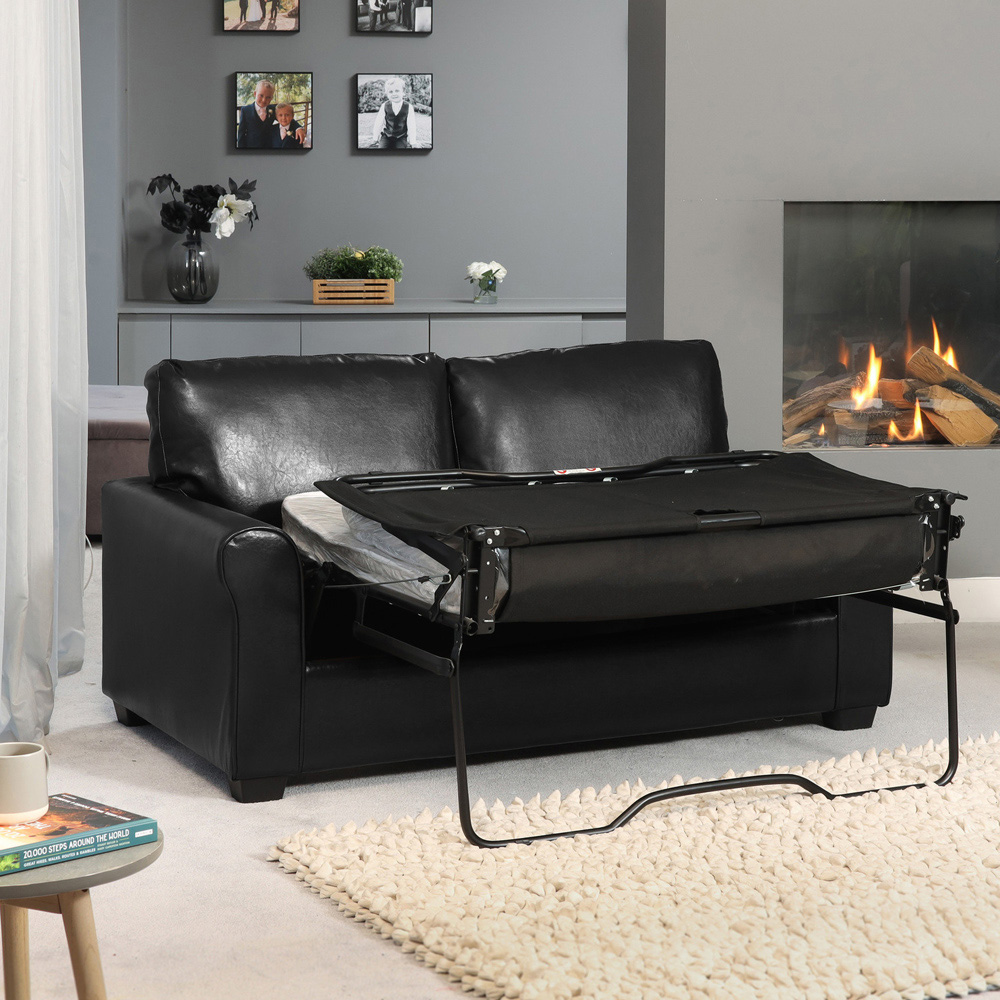 Stay comfortable all day and night on this Lauderdale 2 Seater Black Bonded Leather Sofa Bed. This spacious pull-out sofa seamlessly combines style and functionality. Designed with a fixed-back sofa design, this double sleeper sofa bed offers ample seating space during the day and easily transforms into a comfortable bed at night - perfect for overnight guests. Crafted from solid hardwood, the sofa bed ensures durability and stability for years to come. Upholstered in durable bonded leather, this sofa exudes sophistication and elegance. Moreover, it features faux leather on low-stress areas for added resilience, ensuring longevity and easy maintenance. Equipped with a spacious pull-out mattress measuring 180 x 100 x 10cm, this sofa bed provides a comfortable sleeping surface for your guests, ensuring a restful night's sleep. Plus, you do not need to worry about its assembly, the two-man delivery team will deliver and assemble this piece of furniture straight to your home, saving you time and effort.